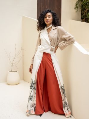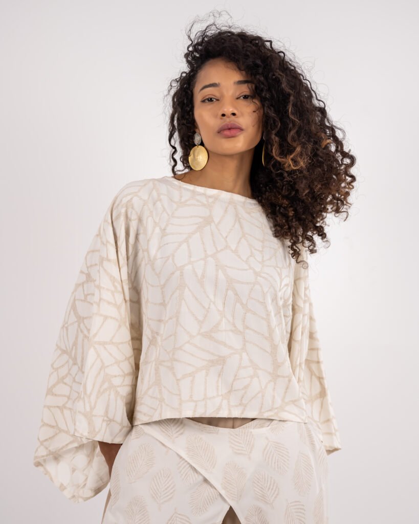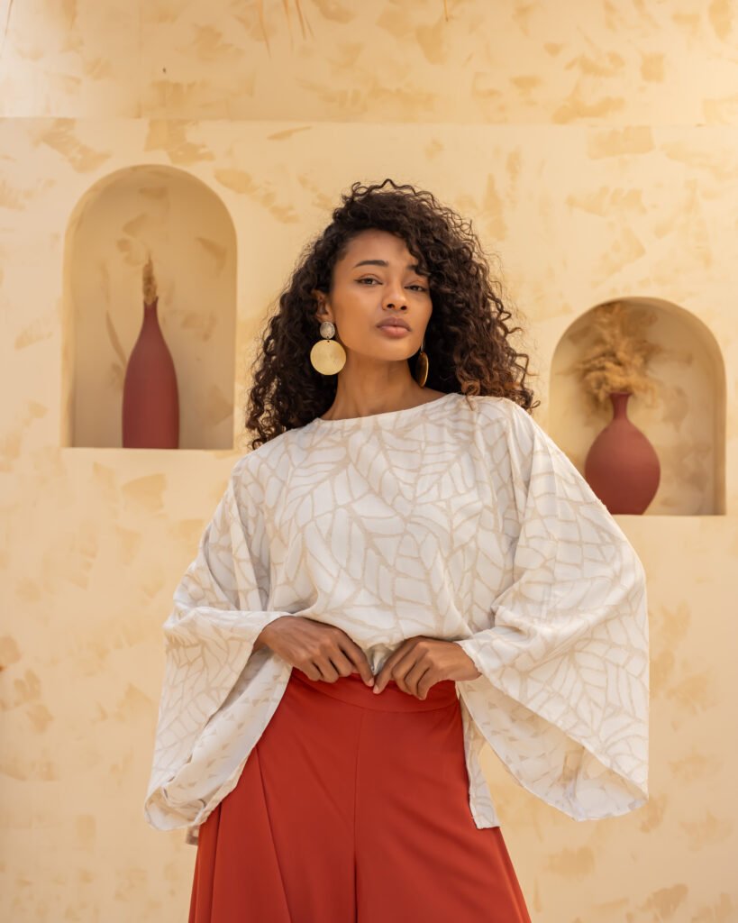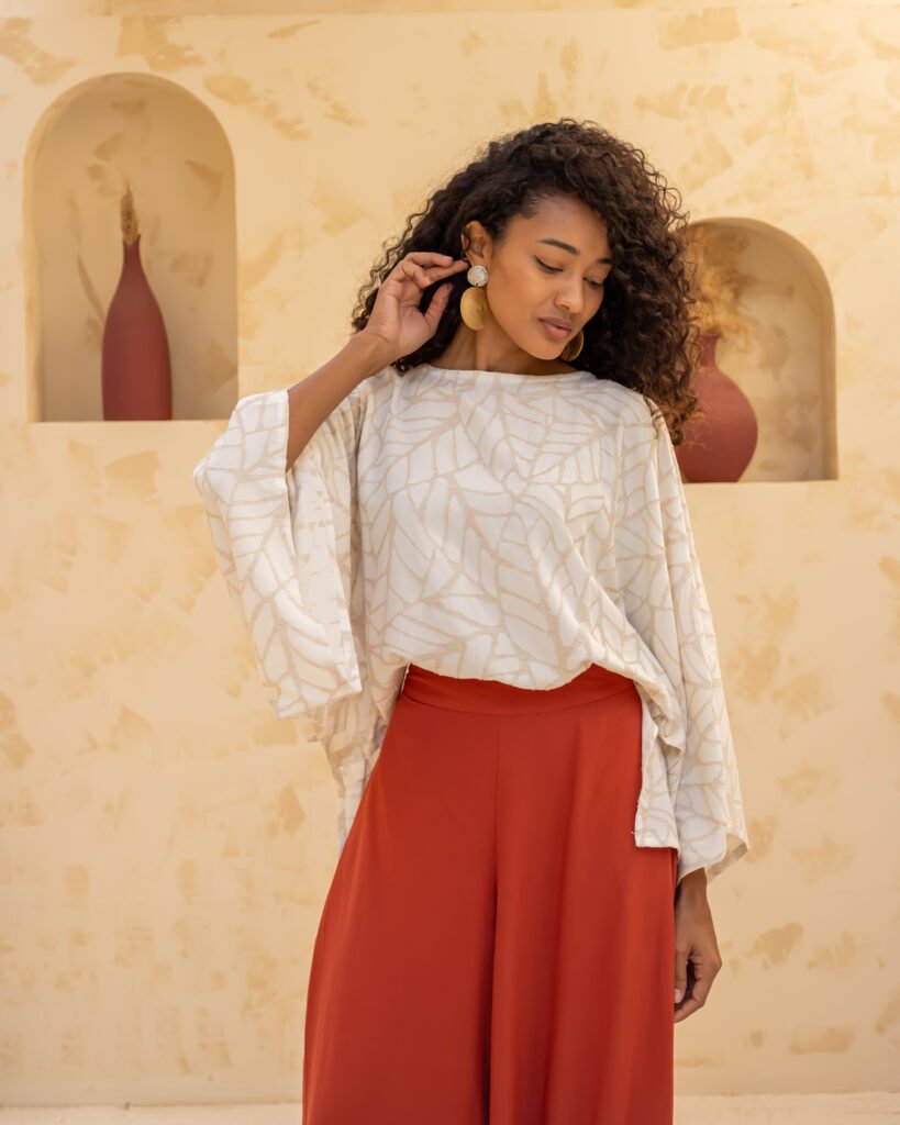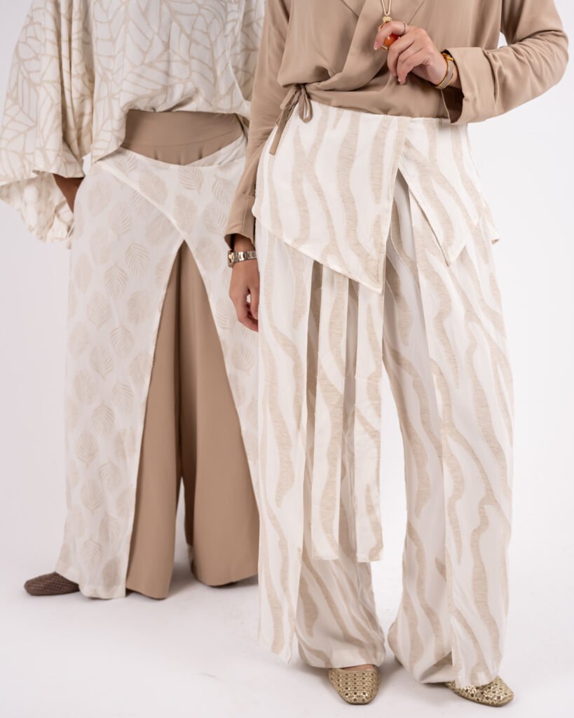 بنطال واسع بيج بطبقة أمامية بنقشة أوراق الشجر