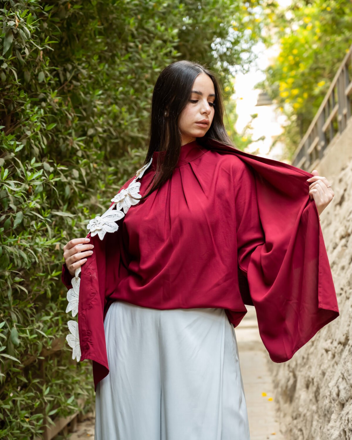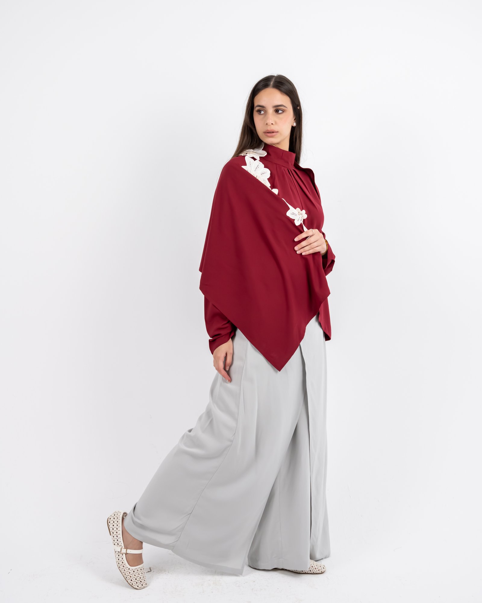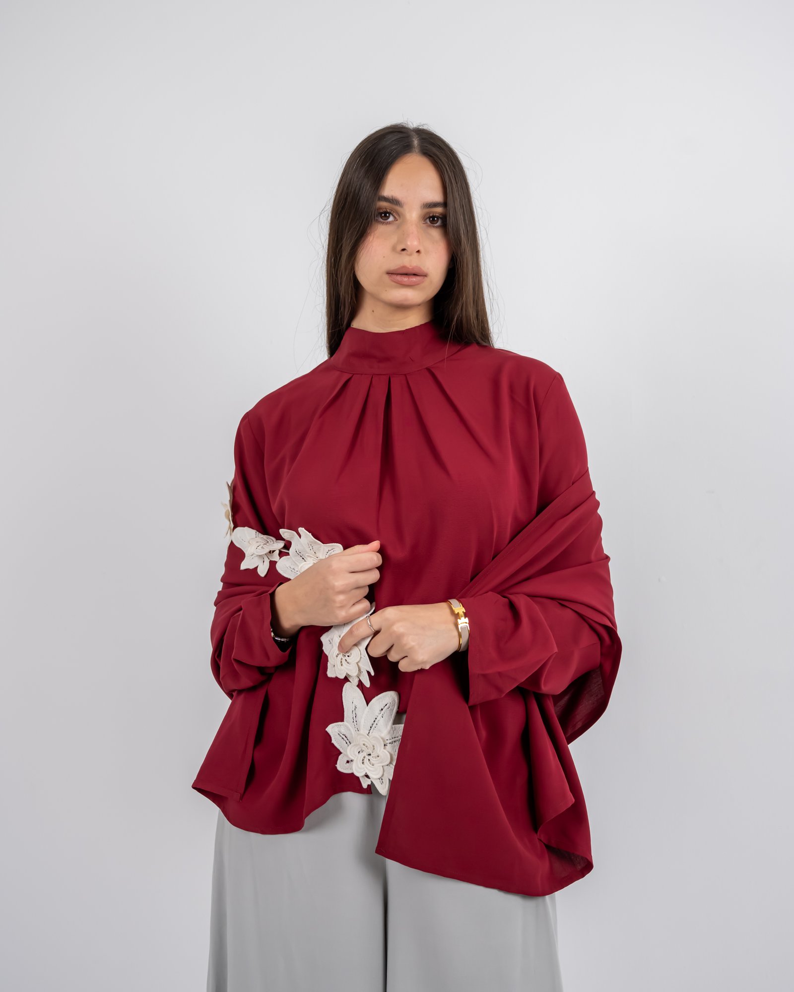 يجمع هذا التوب الأحمر الداكن بين الأناقة وتعدد الاستخدامات في تصميم واحد خالد. يضفي الشال القابل للفصل والمزخرف بأزهار رقيقة باللون الأبيض الفاتح لمسة فنية وأنثوية ترتقي بالإطلالة من البساطة إلى الروعة. سواء تم ارتداؤها منسدلة للحصول على إطلالة ناعمة ورومانسية أو تم إزالتها للحصول على مظهر أنيق، فإن هذه القطعة توفر لكِ تصميماً أنيقاً في كل مناسبة.
