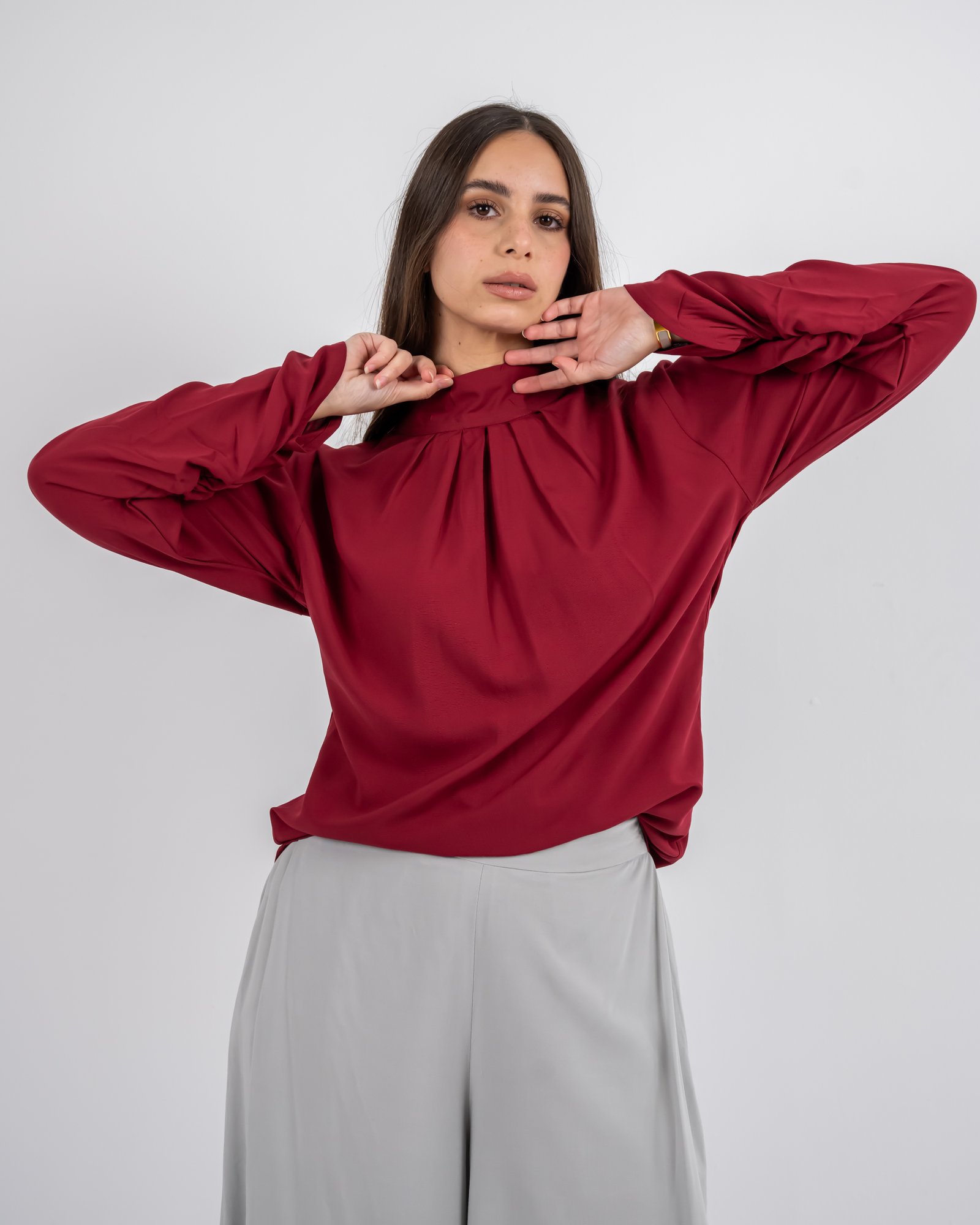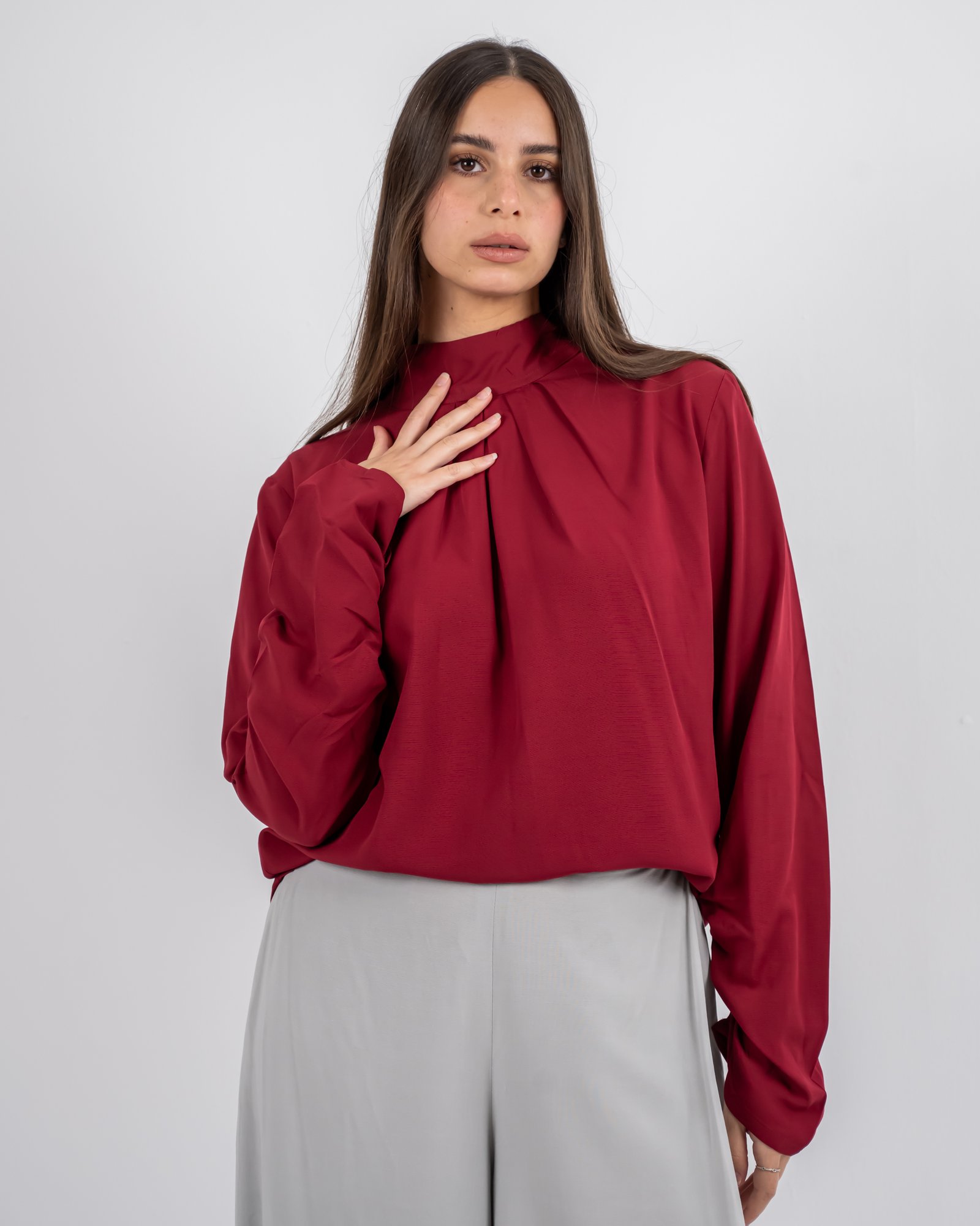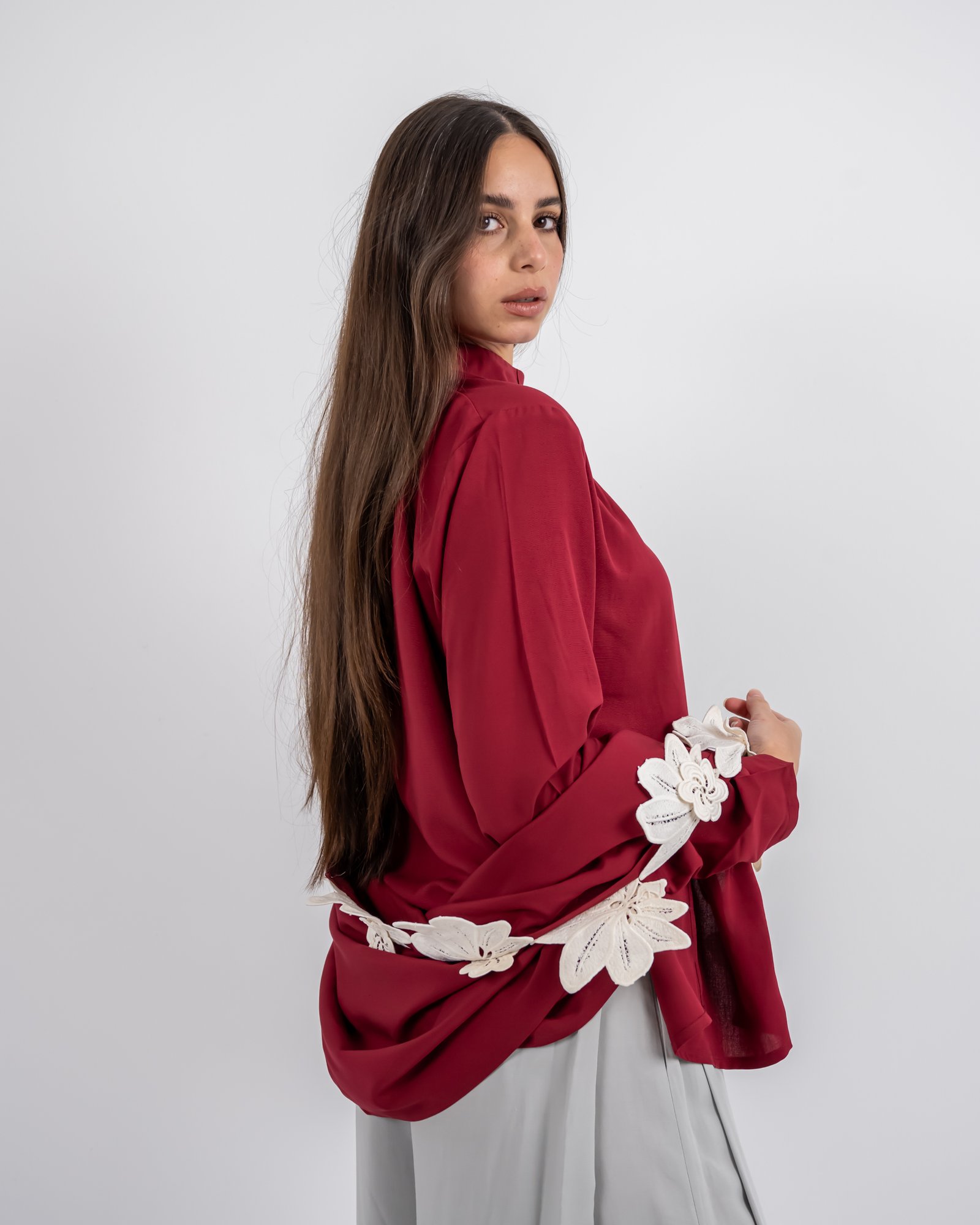يجمع هذا التوب الأحمر الداكن بين الأناقة وتعدد الاستخدامات في تصميم واحد خالد. يضفي الشال القابل للفصل والمزخرف بأزهار رقيقة باللون الأبيض الفاتح لمسة فنية وأنثوية ترتقي بالإطلالة من البساطة إلى الروعة. سواء تم ارتداؤها منسدلة للحصول على إطلالة ناعمة ورومانسية أو تم إزالتها للحصول على مظهر أنيق، فإن هذه القطعة توفر لكِ تصميماً أنيقاً في كل مناسبة.