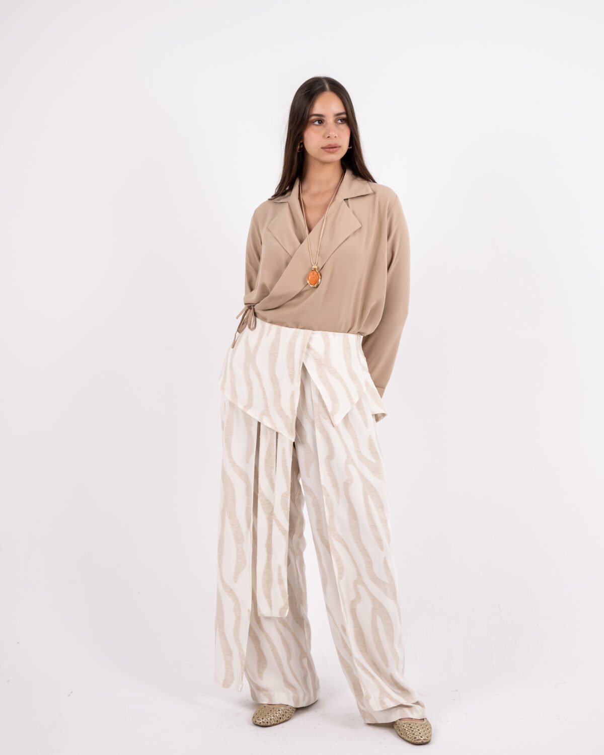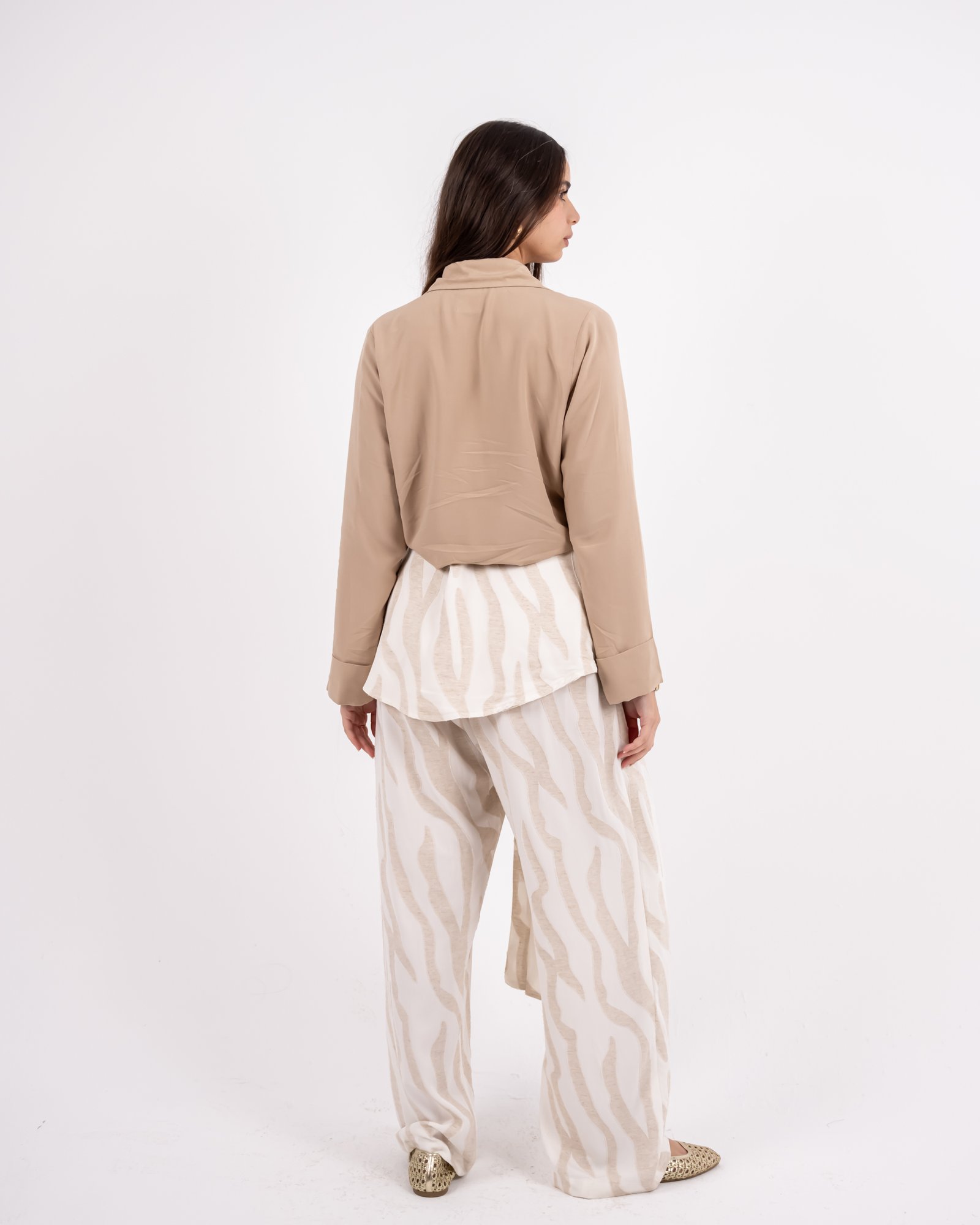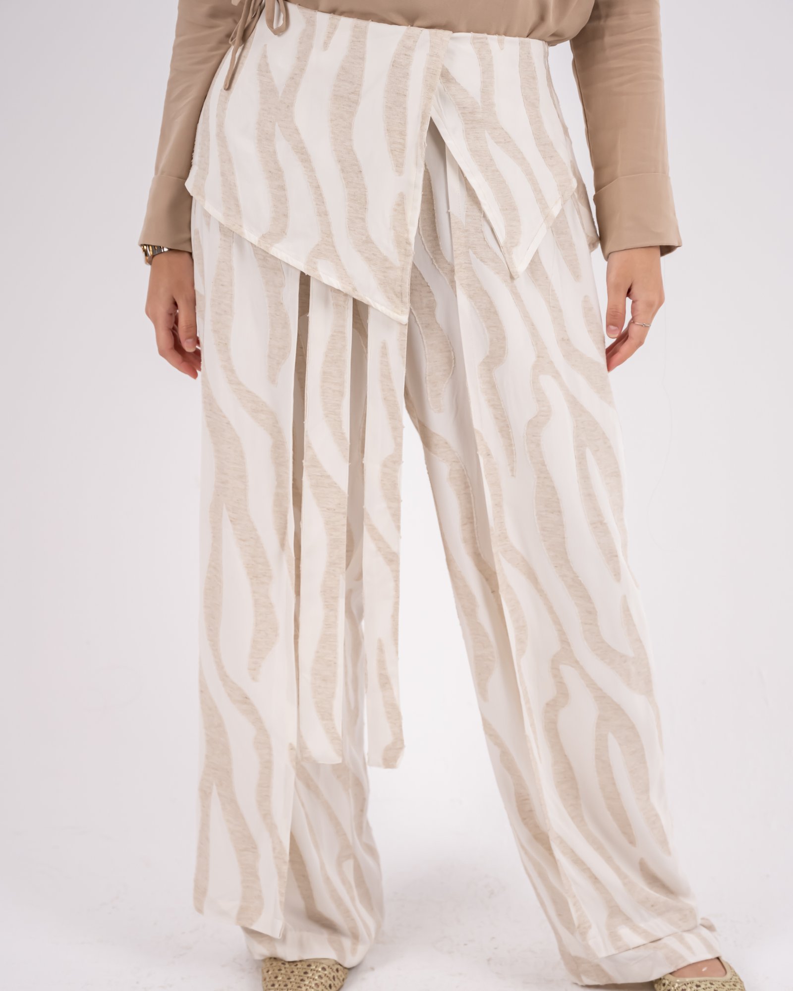 يجمع هذا البنطال بين الانسيابية والأناقة الهادئة من خلال تصميمه المكوّن من طبقات أمامية وخلفية تضيف عمقاً وانسياباً فريداً إلى الإطلالة. النقشة البيج المستوحاة من الطبيعة تمنحه طابعاً مميزاً وملمساً فاخراً. مصنوع من قماش اللينن كريب الخفيف والمريح، ليعكس روح رازية التي تمزج بين الأناقة العصرية والاحتشام بأسلوب متفرّد.