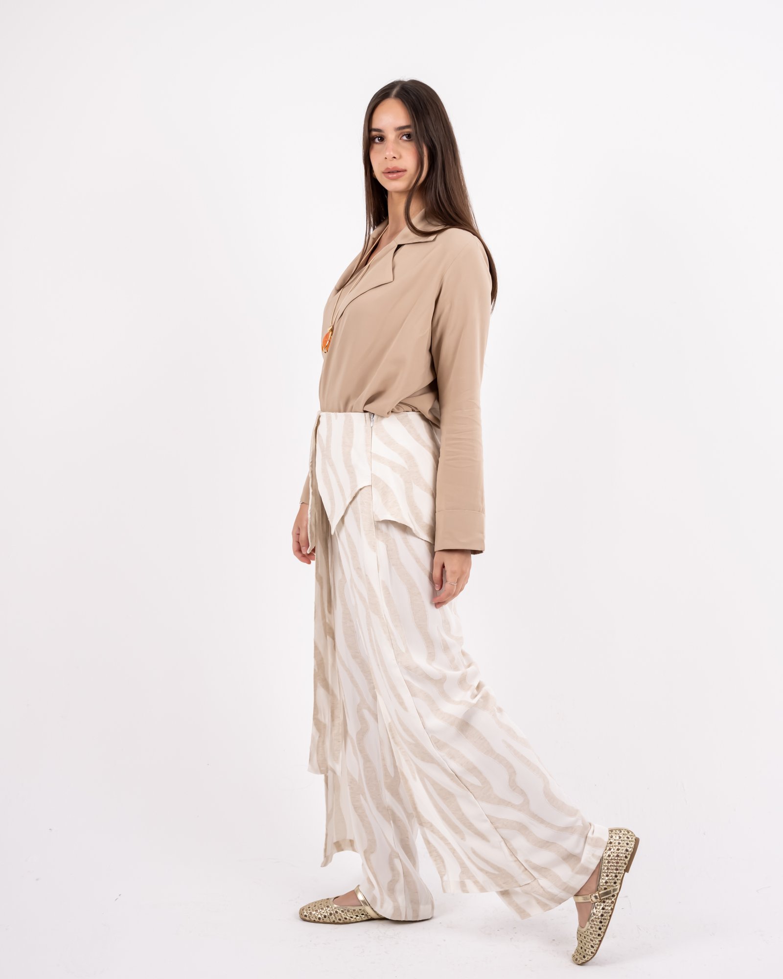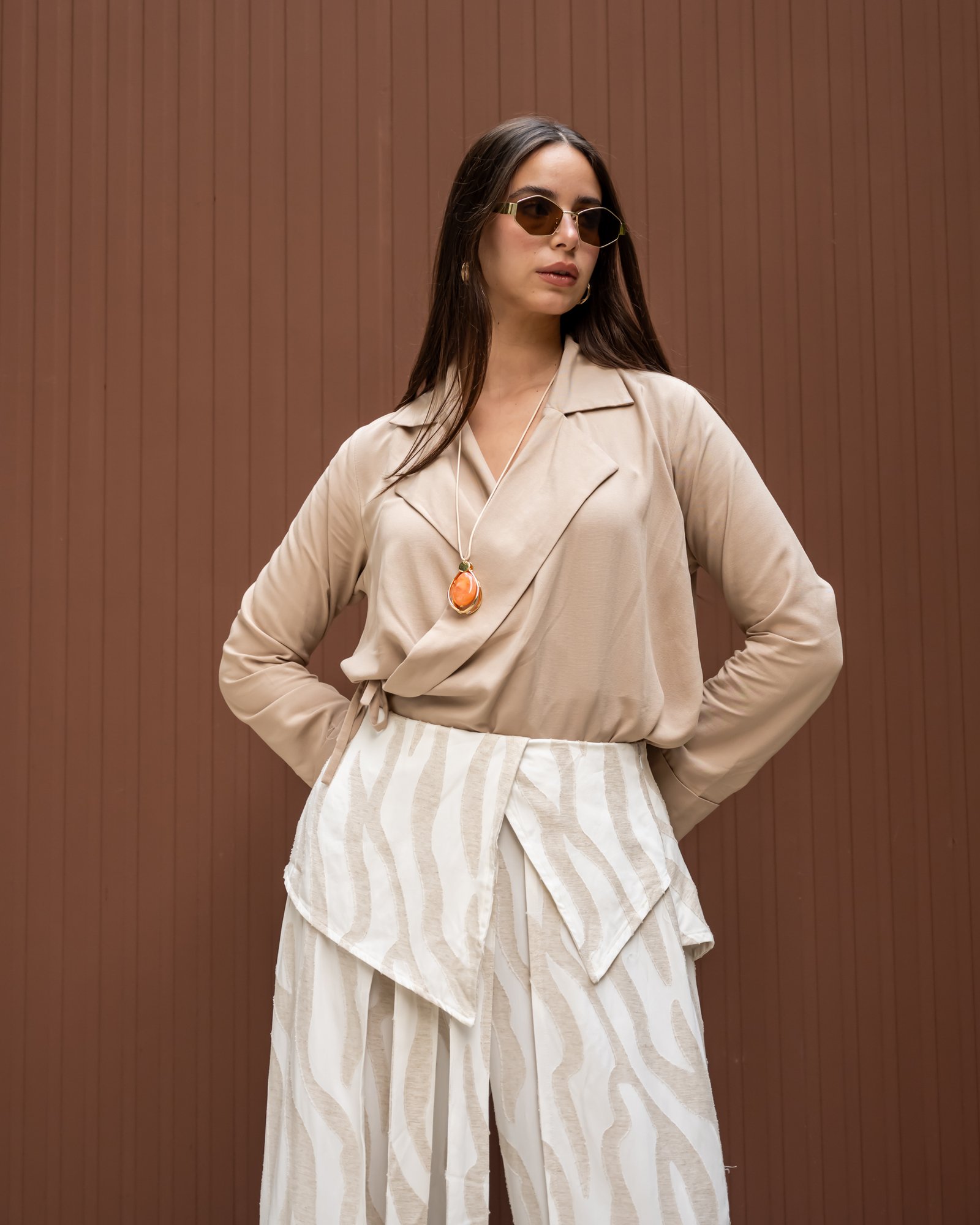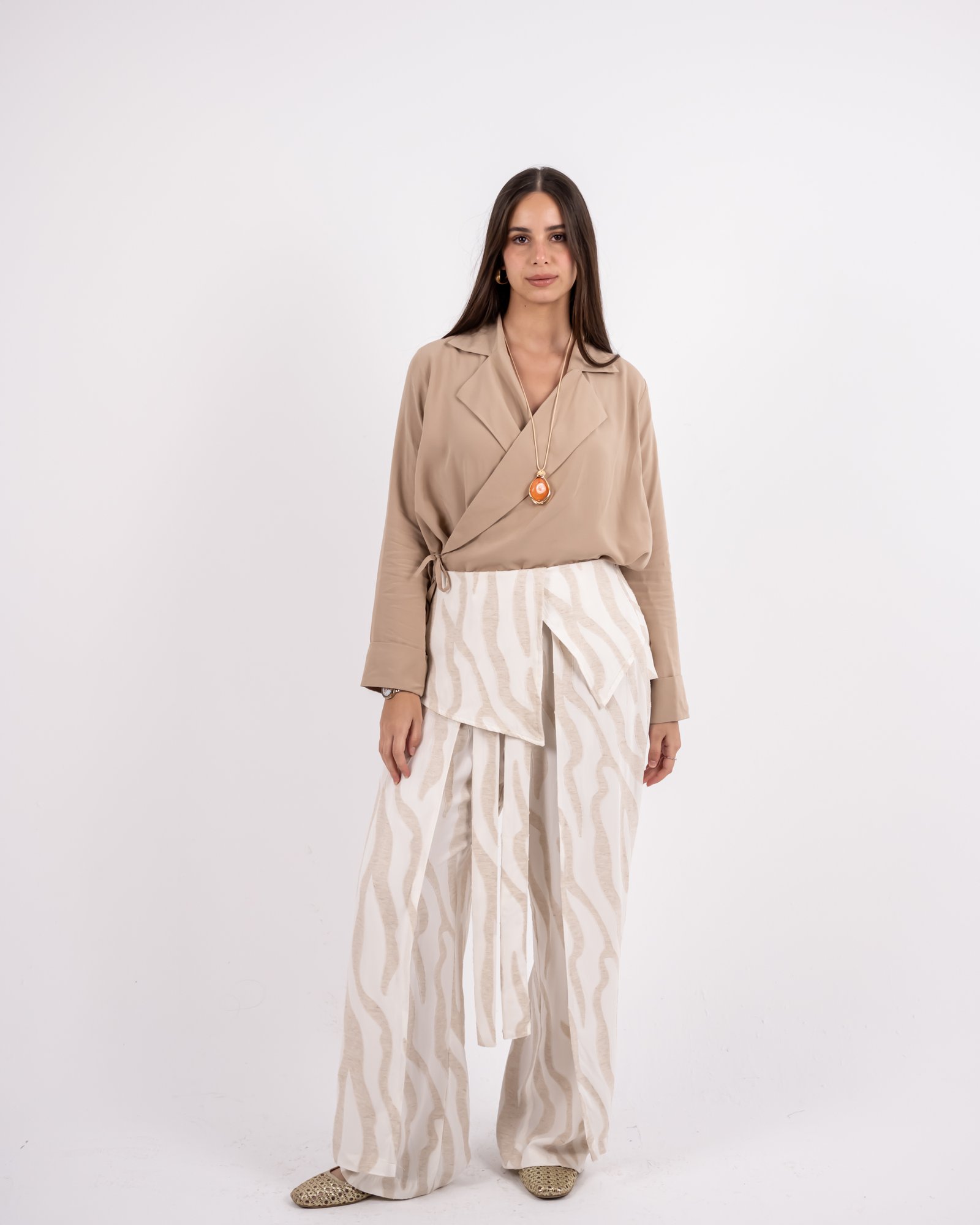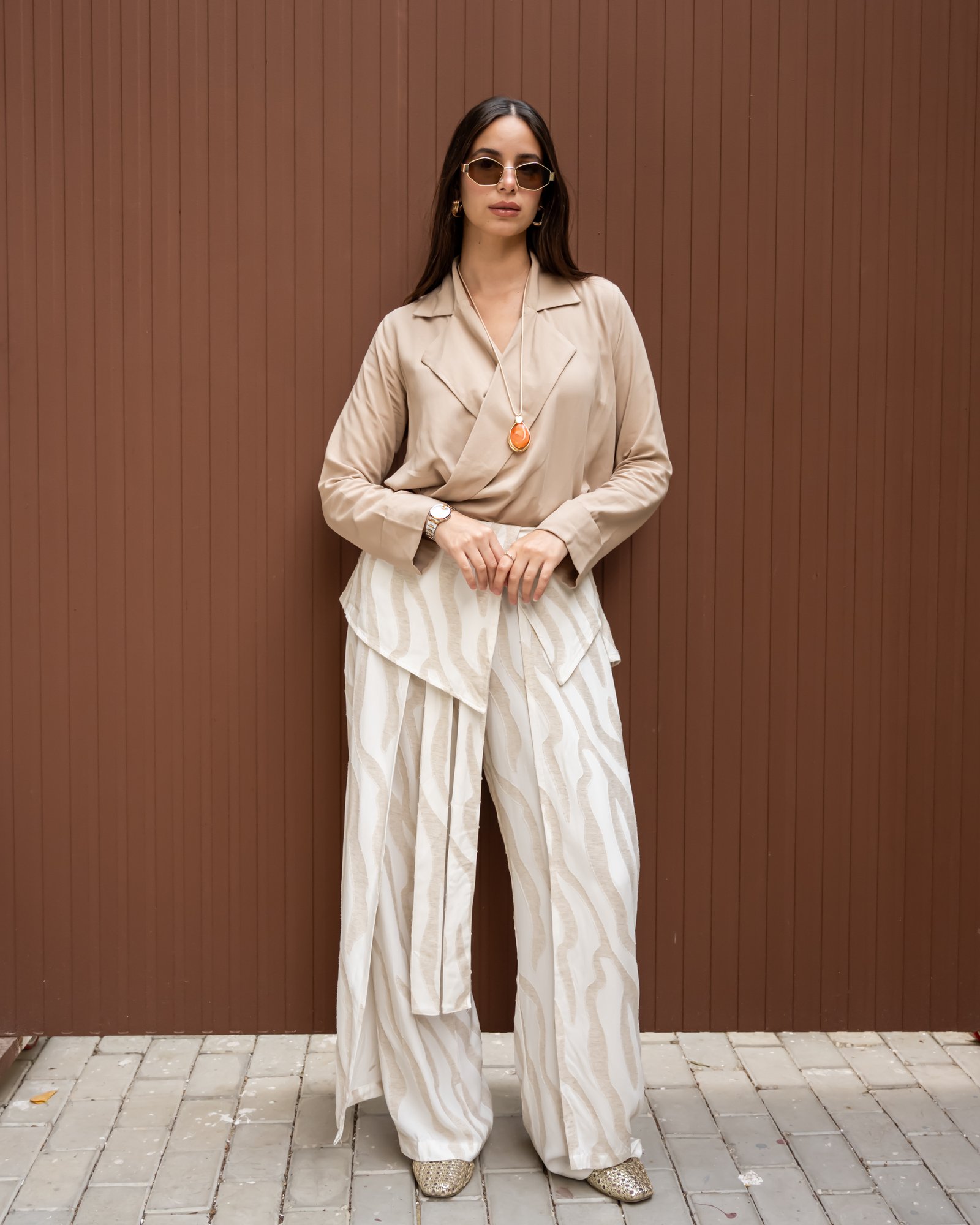 يجمع هذا البنطال بين الانسيابية والأناقة الهادئة من خلال تصميمه المكوّن من طبقات أمامية وخلفية تضيف عمقاً وانسياباً فريداً إلى الإطلالة. النقشة البيج المستوحاة من الطبيعة تمنحه طابعاً مميزاً وملمساً فاخراً. مصنوع من قماش اللينن كريب الخفيف والمريح، ليعكس روح رازية التي تمزج بين الأناقة العصرية والاحتشام بأسلوب متفرّد.