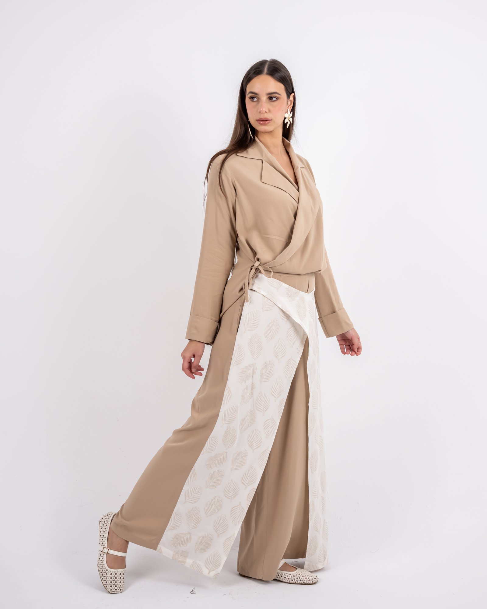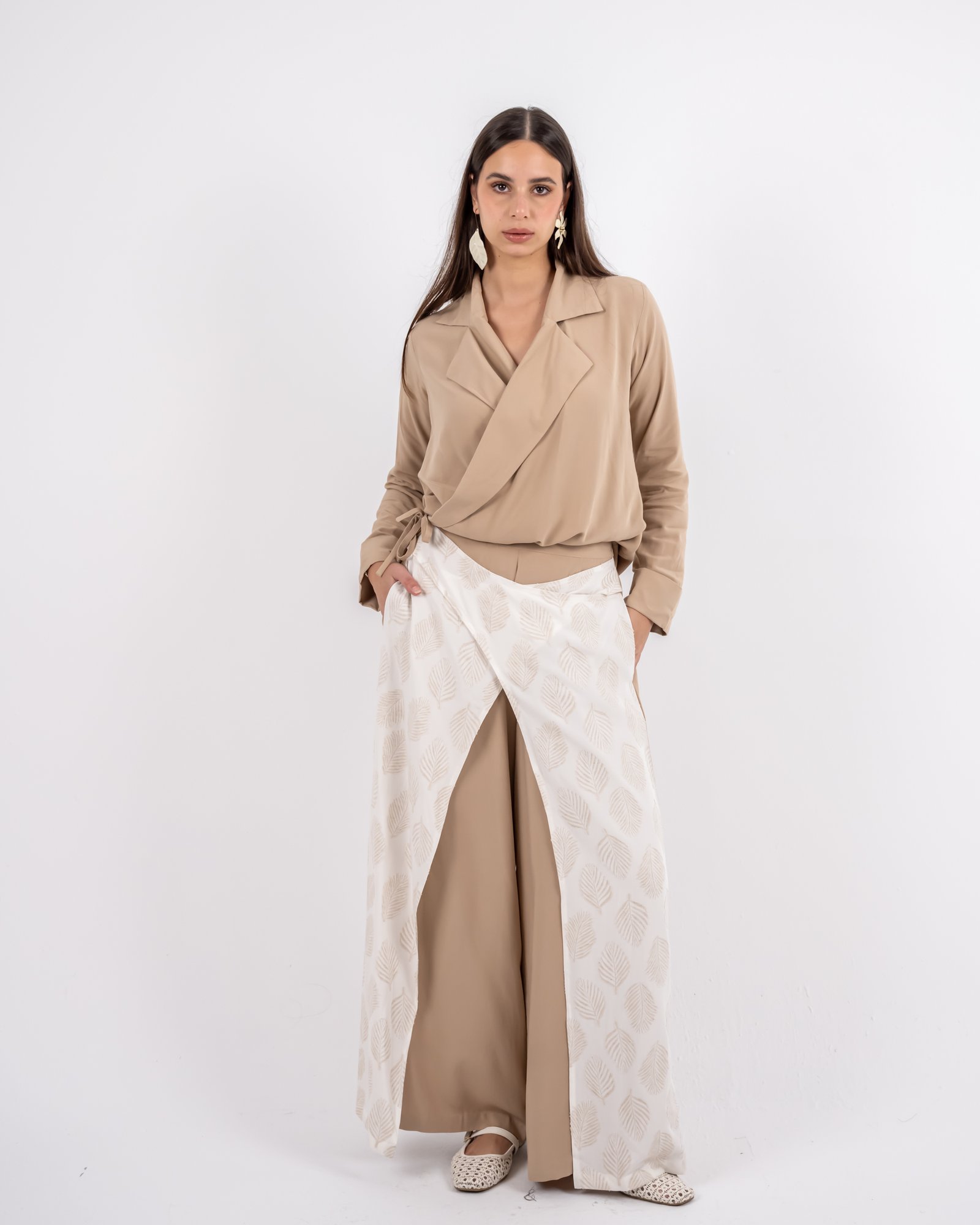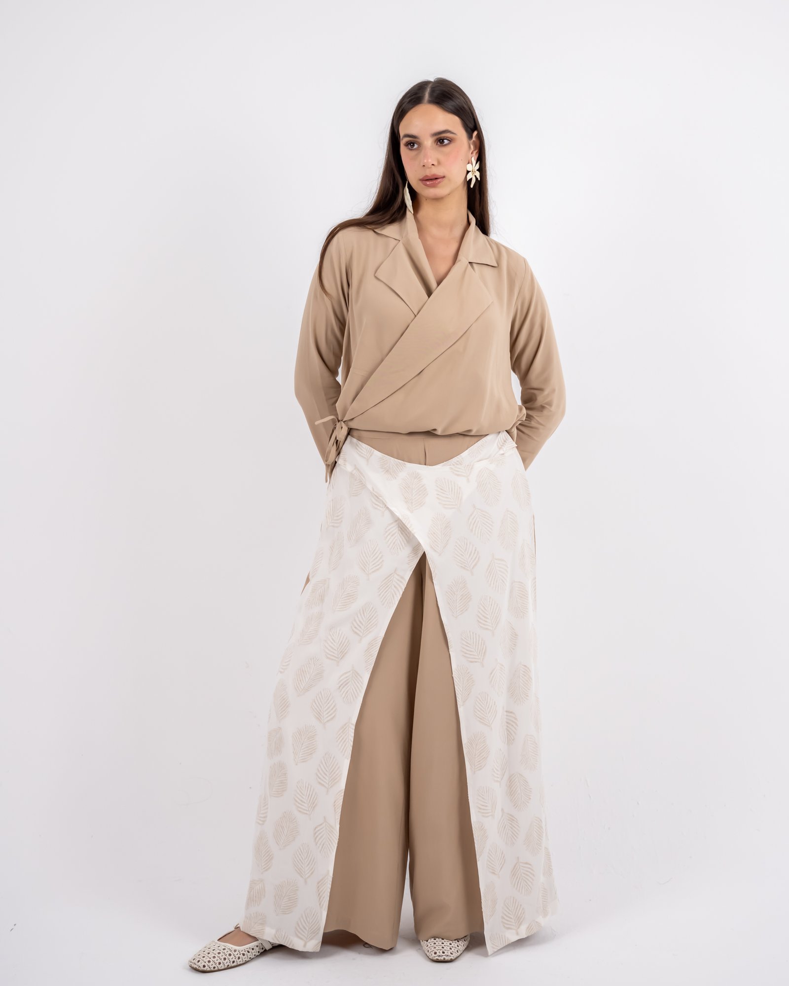يتميّز هذا البنطال الواسع بتصميم يجمع بين البساطة والتفرّد، مع قاعدة بلون بيج انسيابي وطبقة علوية منقوشة بنقشة أوراق تضيف عمقاً وحركة للإطلالة. توازن الطبقة المنقوشة بين النعومة والتفاصيل المميزة لتمنحك مظهراً متناسقاً وراقياً. مثالي للإطلالات النهارية الأنيقة أو المناسبات المسائية الهادئة بأسلوب رازية العصري والمحتشم.