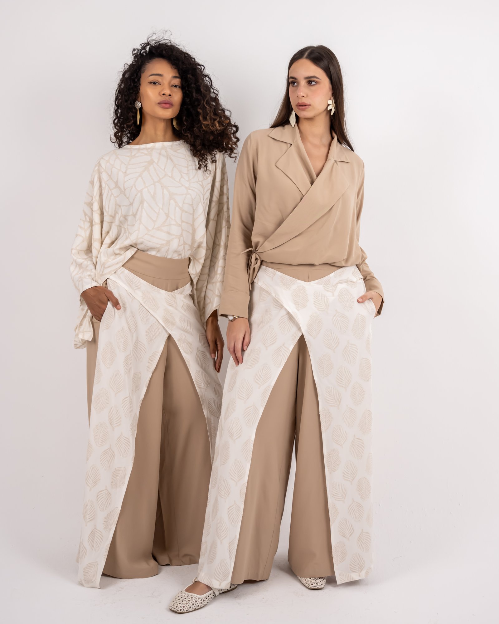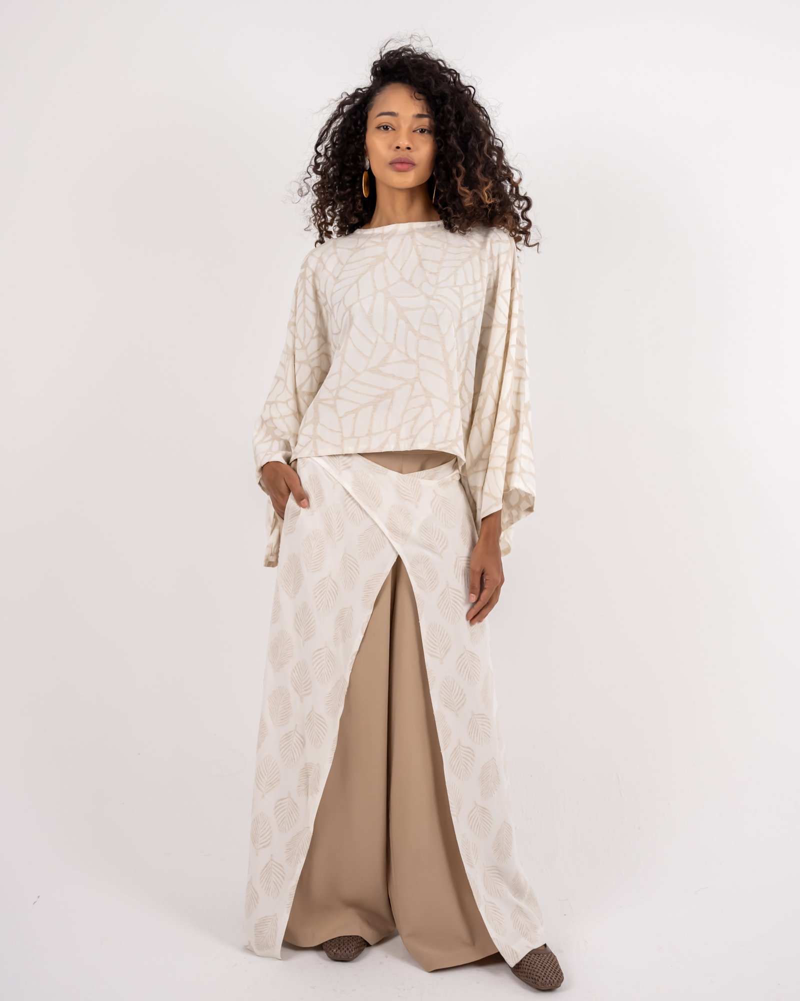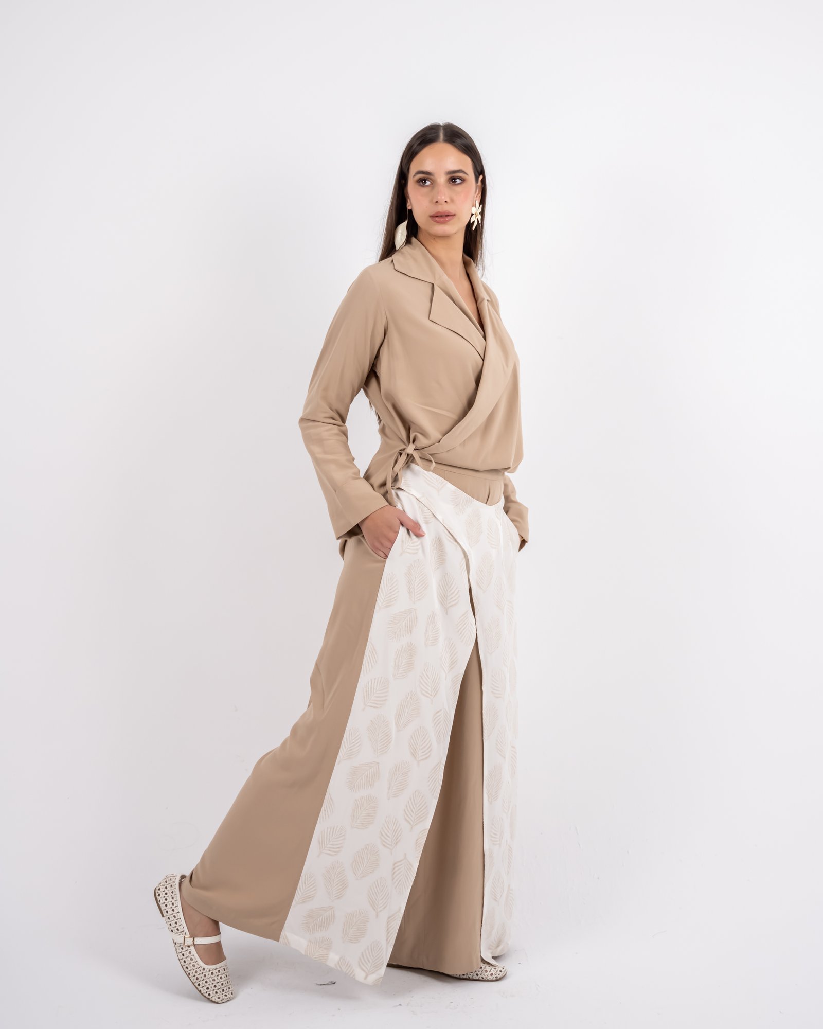 يتميّز هذا البنطال الواسع بتصميم يجمع بين البساطة والتفرّد، مع قاعدة بلون بيج انسيابي وطبقة علوية منقوشة بنقشة أوراق تضيف عمقاً وحركة للإطلالة. توازن الطبقة المنقوشة بين النعومة والتفاصيل المميزة لتمنحك مظهراً متناسقاً وراقياً. مثالي للإطلالات النهارية الأنيقة أو المناسبات المسائية الهادئة بأسلوب رازية العصري والمحتشم.