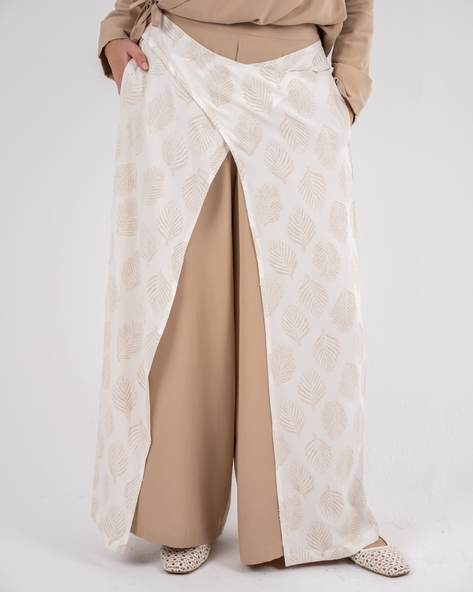 بنطال واسع بيج بطبقة أمامية بنقشة أوراق الشجر