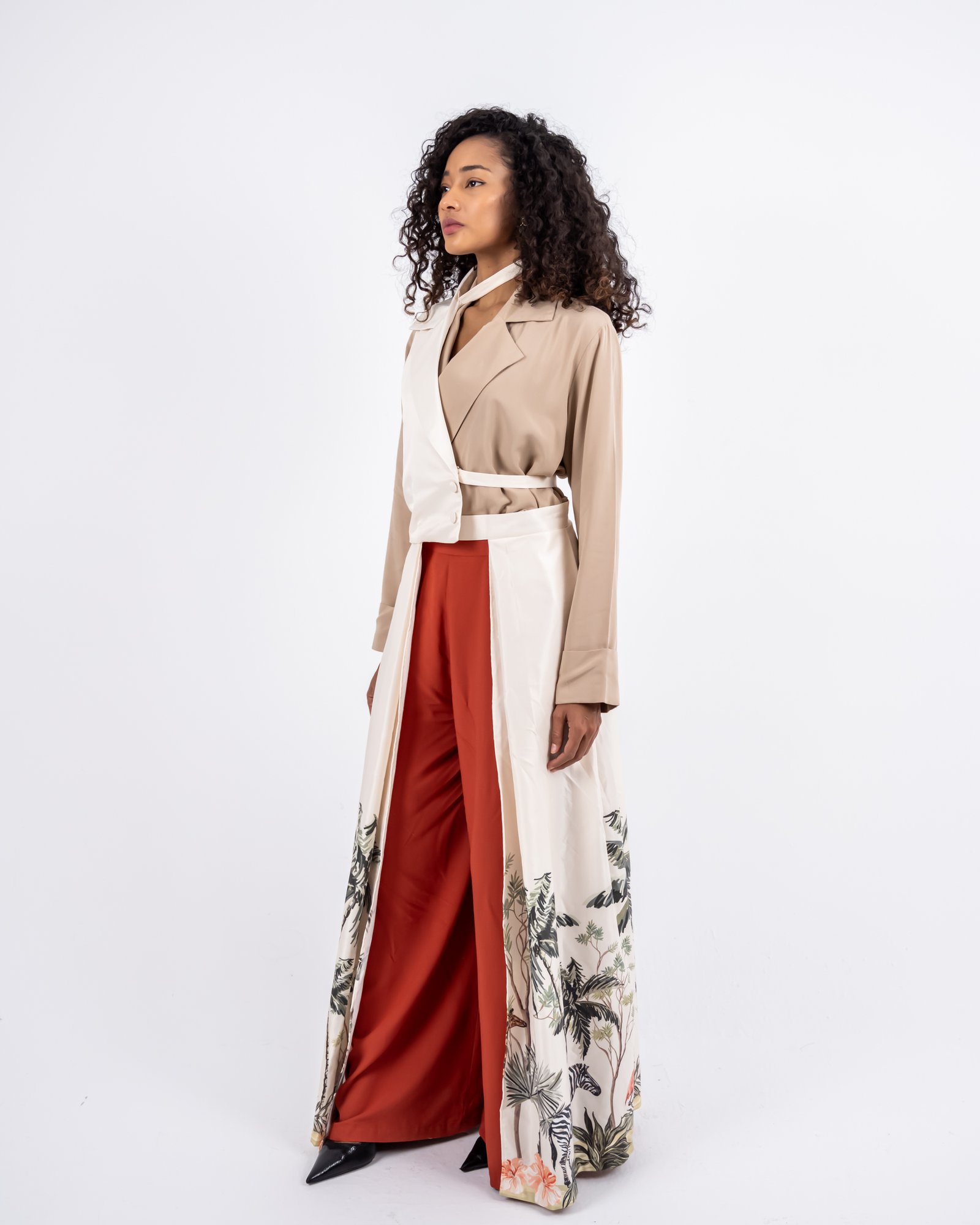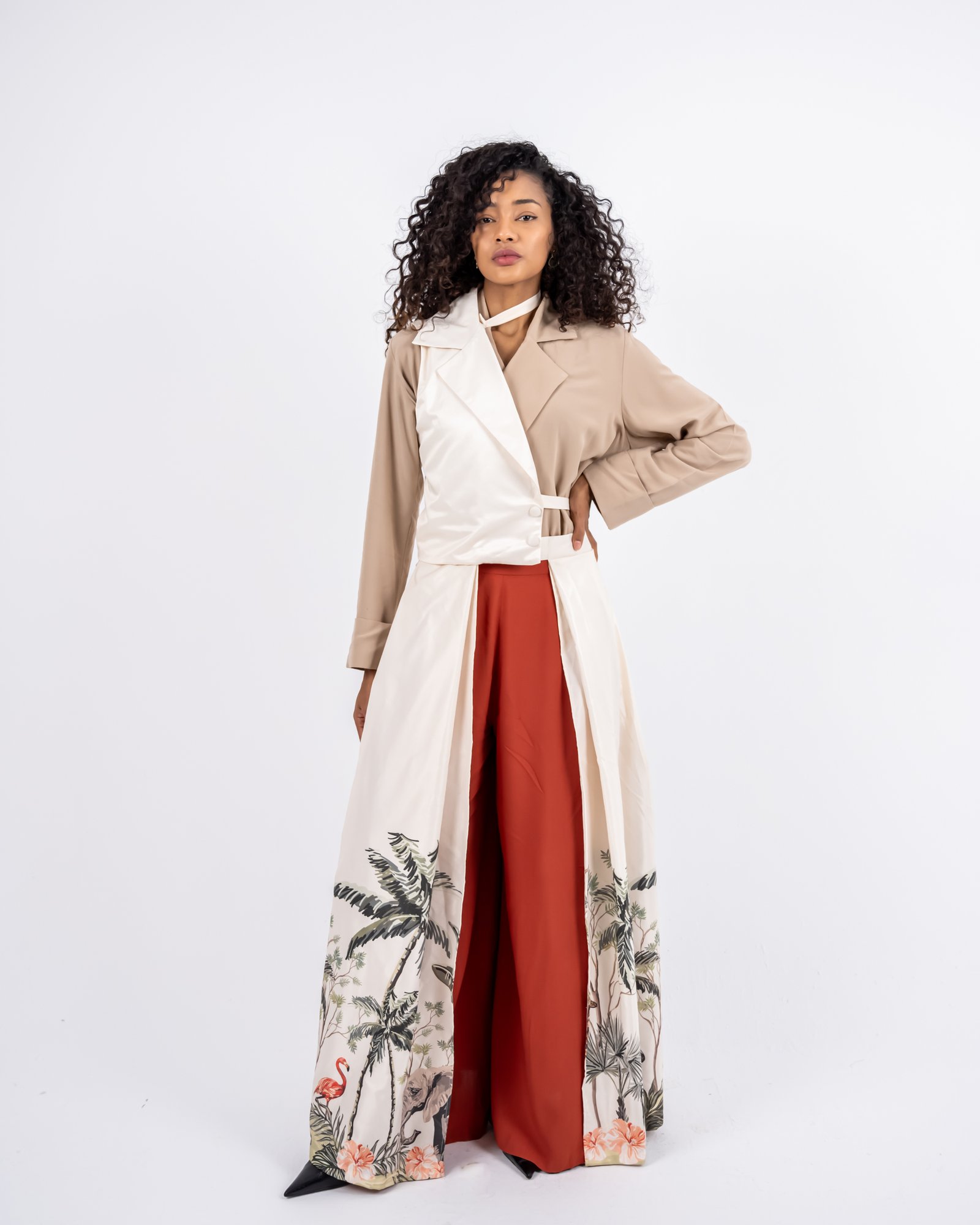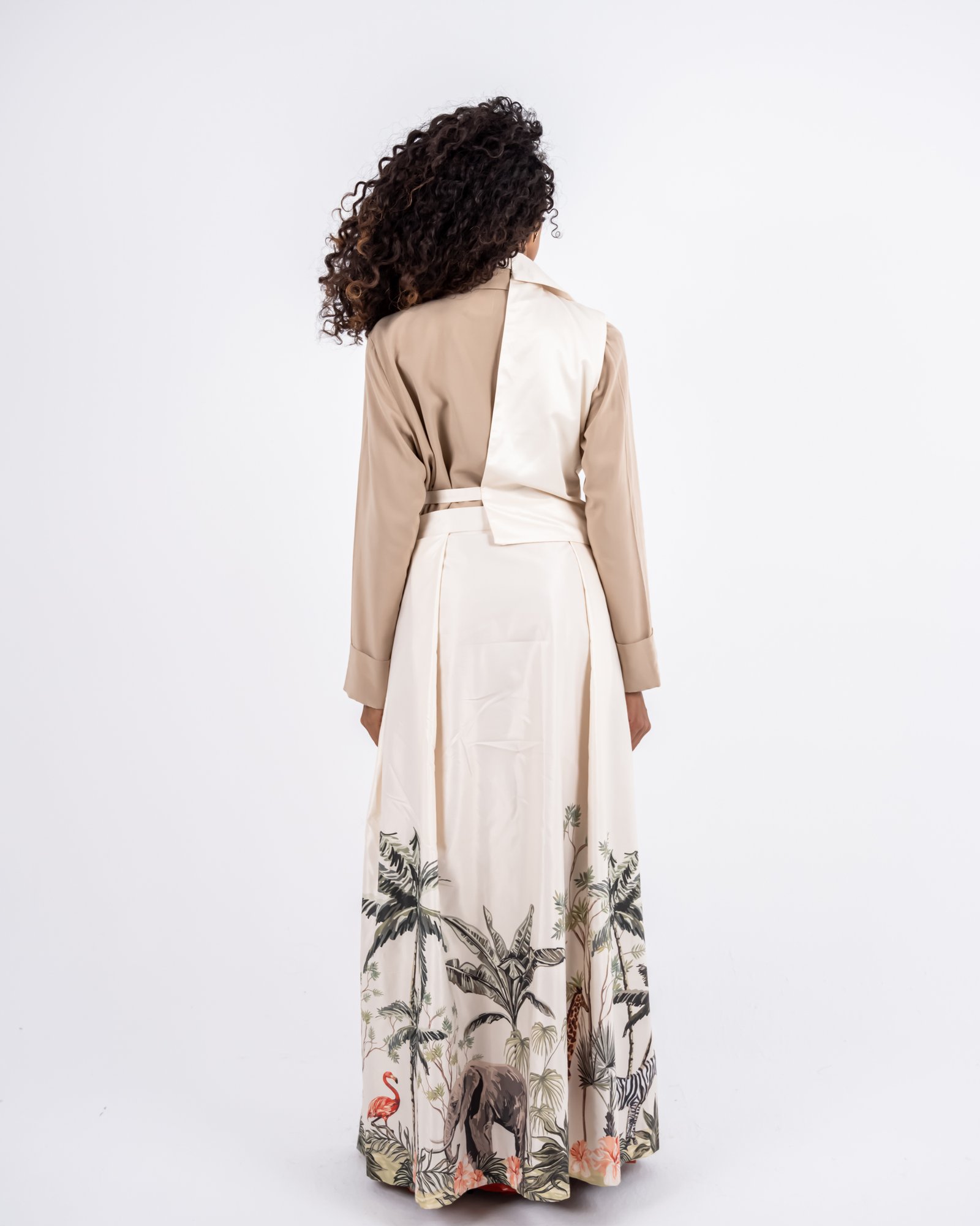 This statement piece redefines contemporary modest fashion with its asymmetric design and artistic safari-inspired print. The beige and ivory palette offers a timeless elegance, while the flowing cut allows it to be layered effortlessly over a blouse and trousers for a modern, structured silhouette. The detailed nature print adds a touch of character, making it a standout piece for those who appreciate creative elegance and versatility.