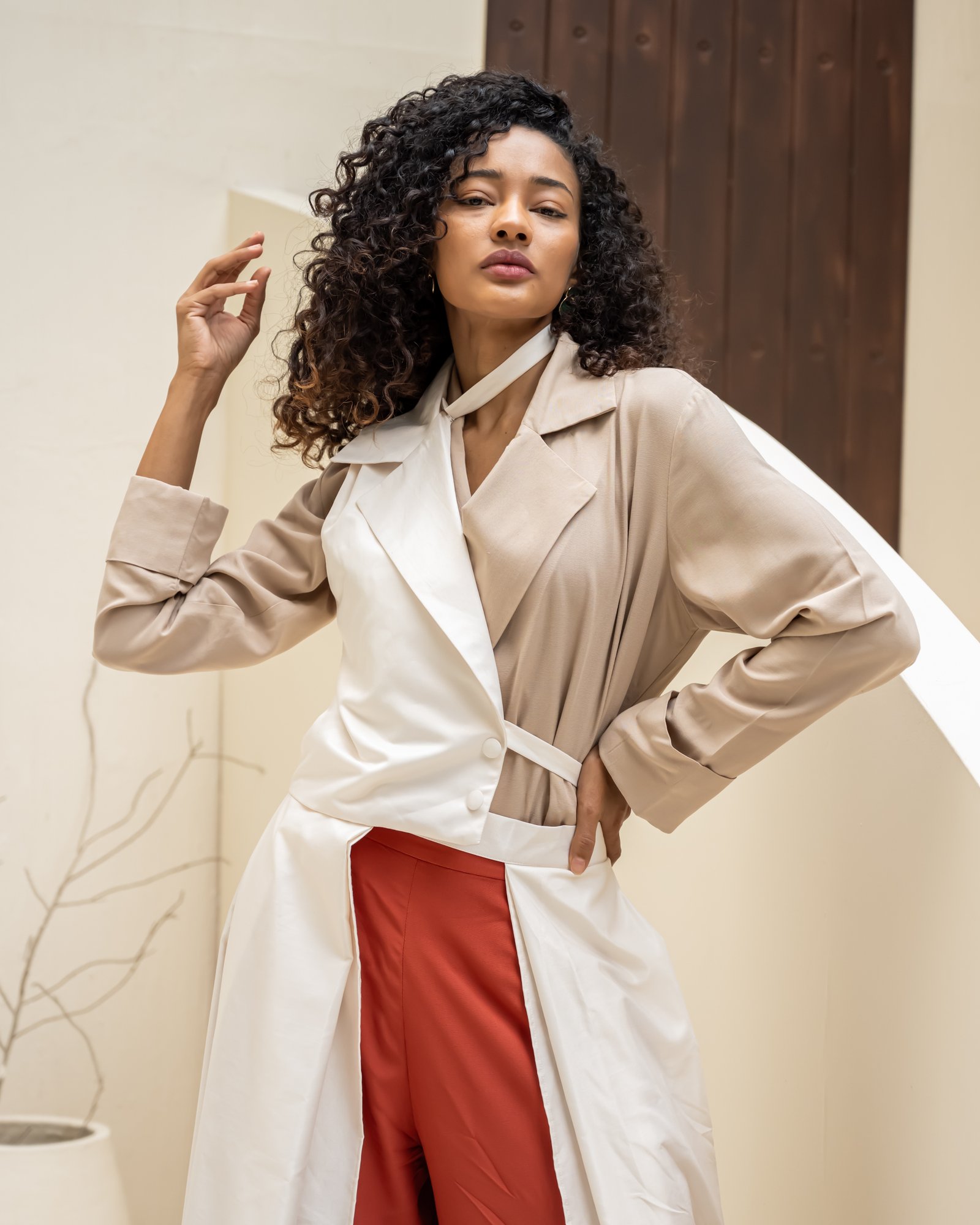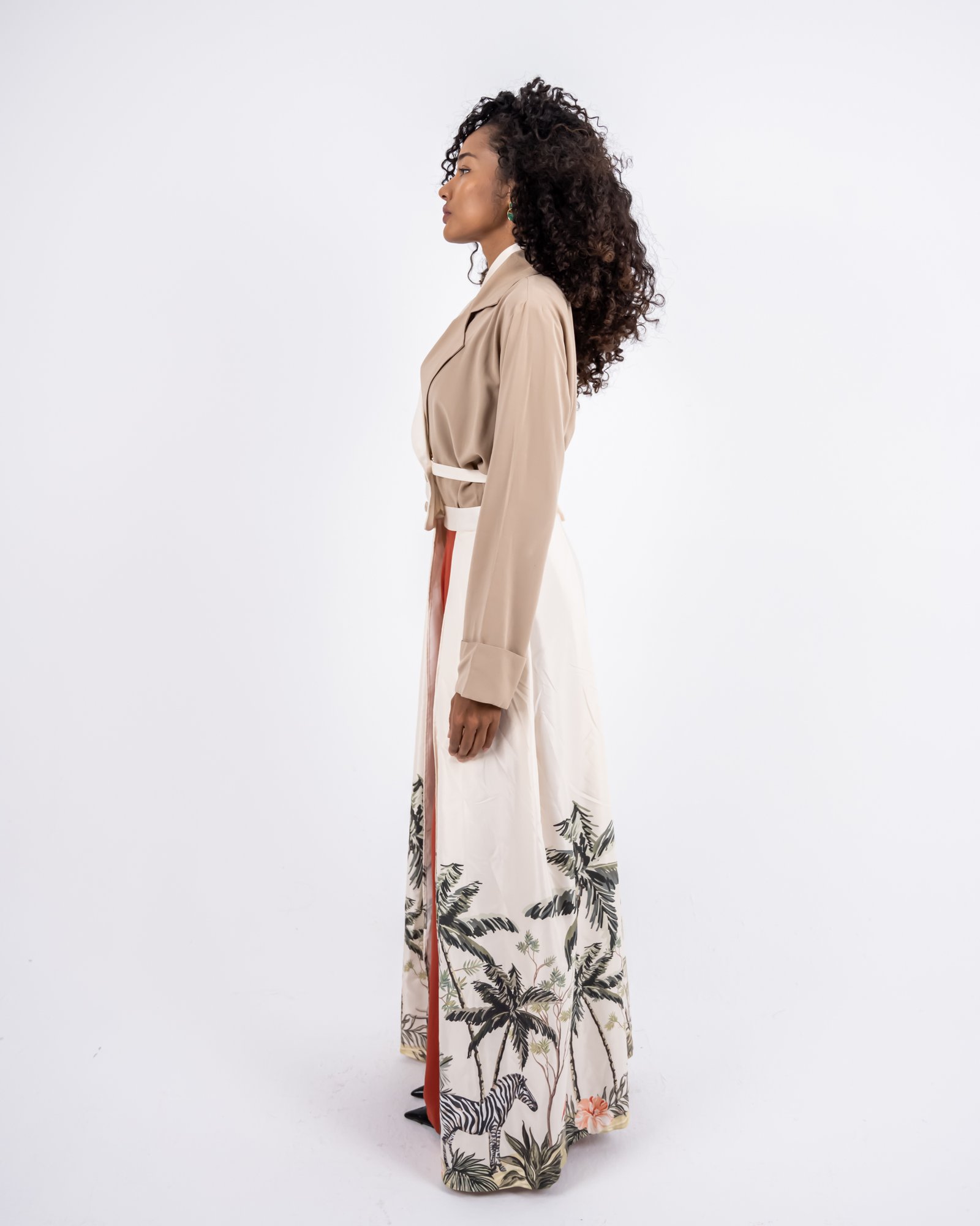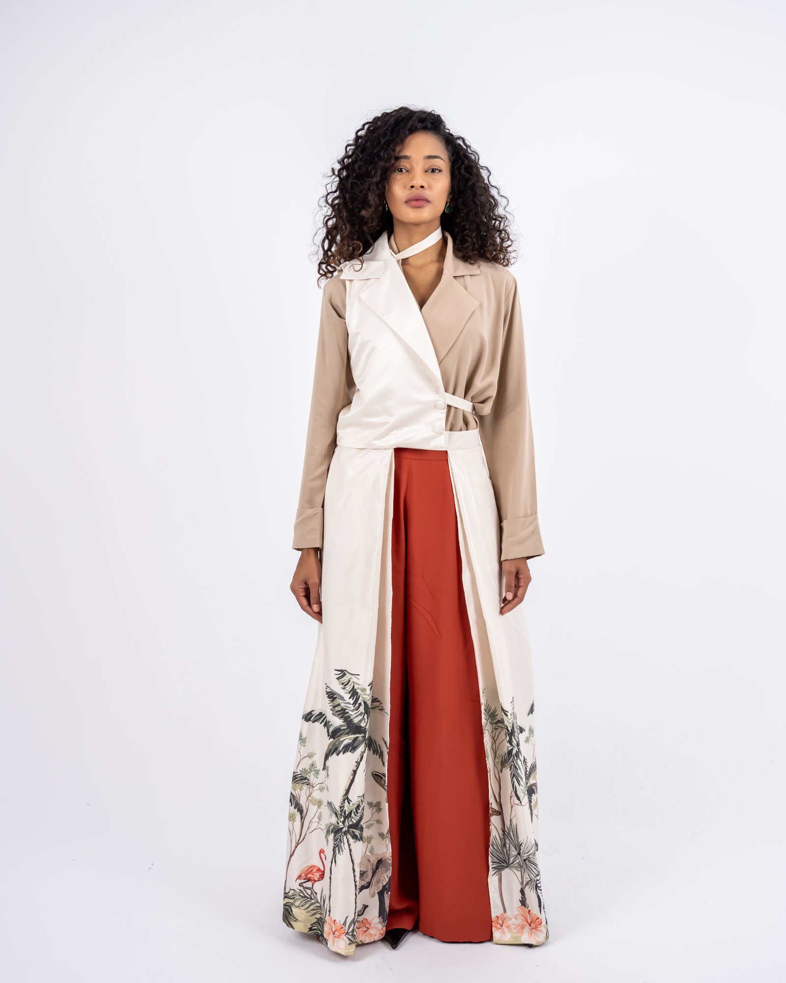 This statement piece redefines contemporary modest fashion with its asymmetric design and artistic safari-inspired print. The beige and ivory palette offers a timeless elegance, while the flowing cut allows it to be layered effortlessly over a blouse and trousers for a modern, structured silhouette. The detailed nature print adds a touch of character, making it a standout piece for those who appreciate creative elegance and versatility.