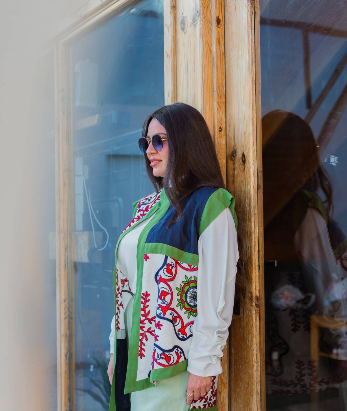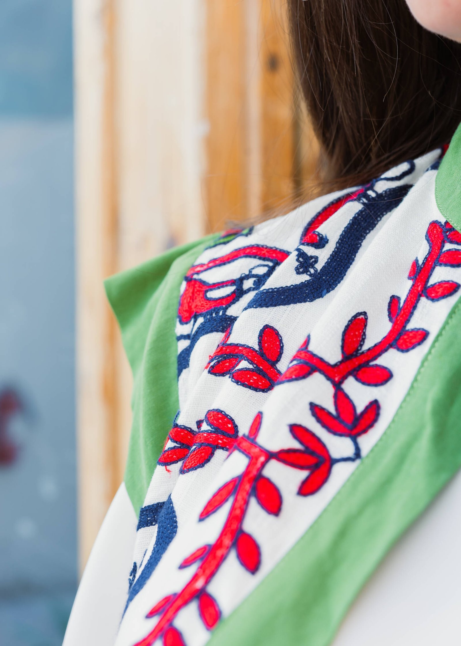from a soft and airy linen blend. Featuring bold, traditional-inspired embroidery in rich reds and blues, framed by a modern green edge. It’s a lightweight layering piece that