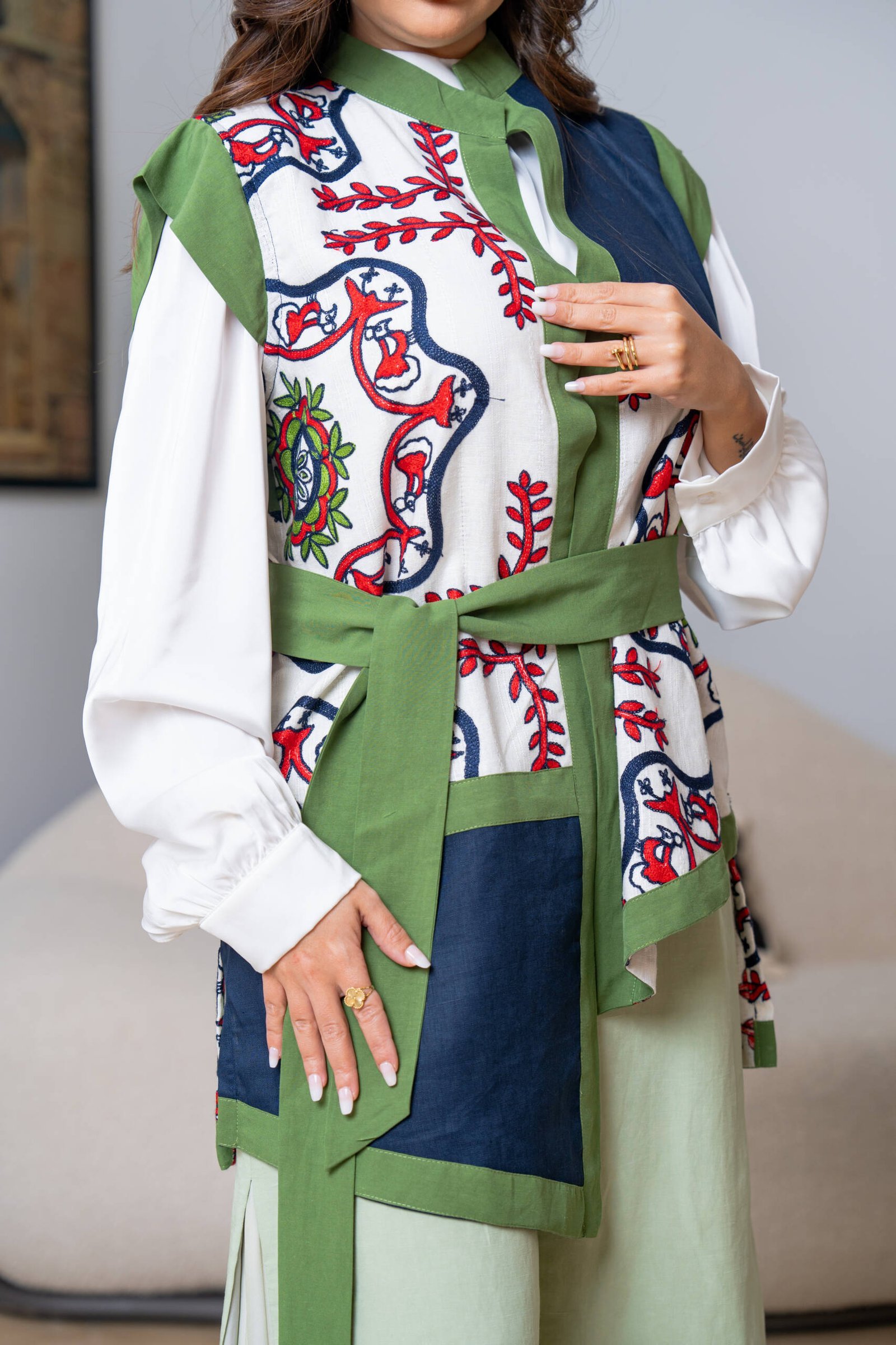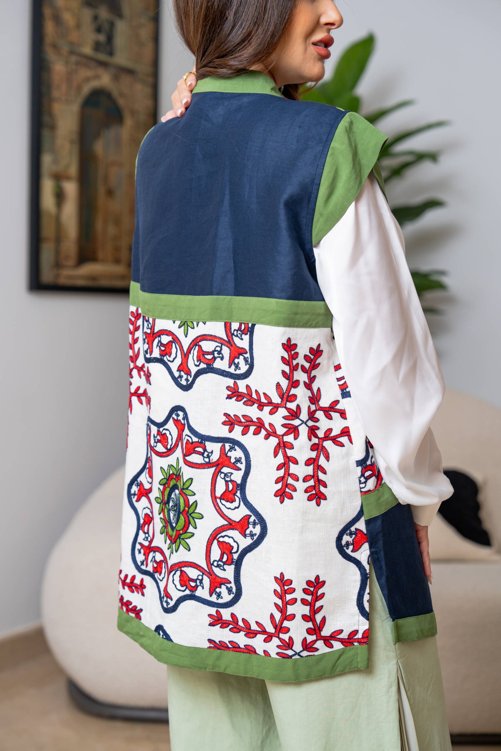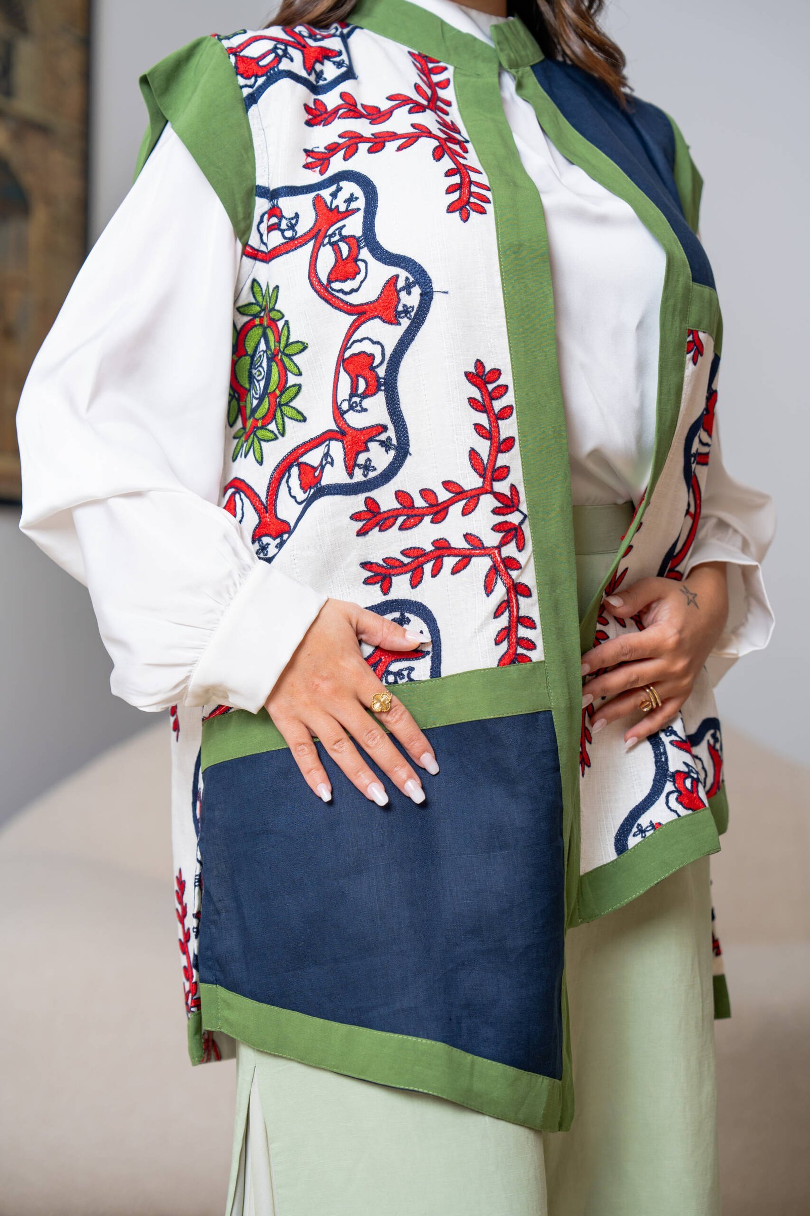 A vest crafted from a linen blend, featuring bold embroidery and vibrant modern color contrasts.