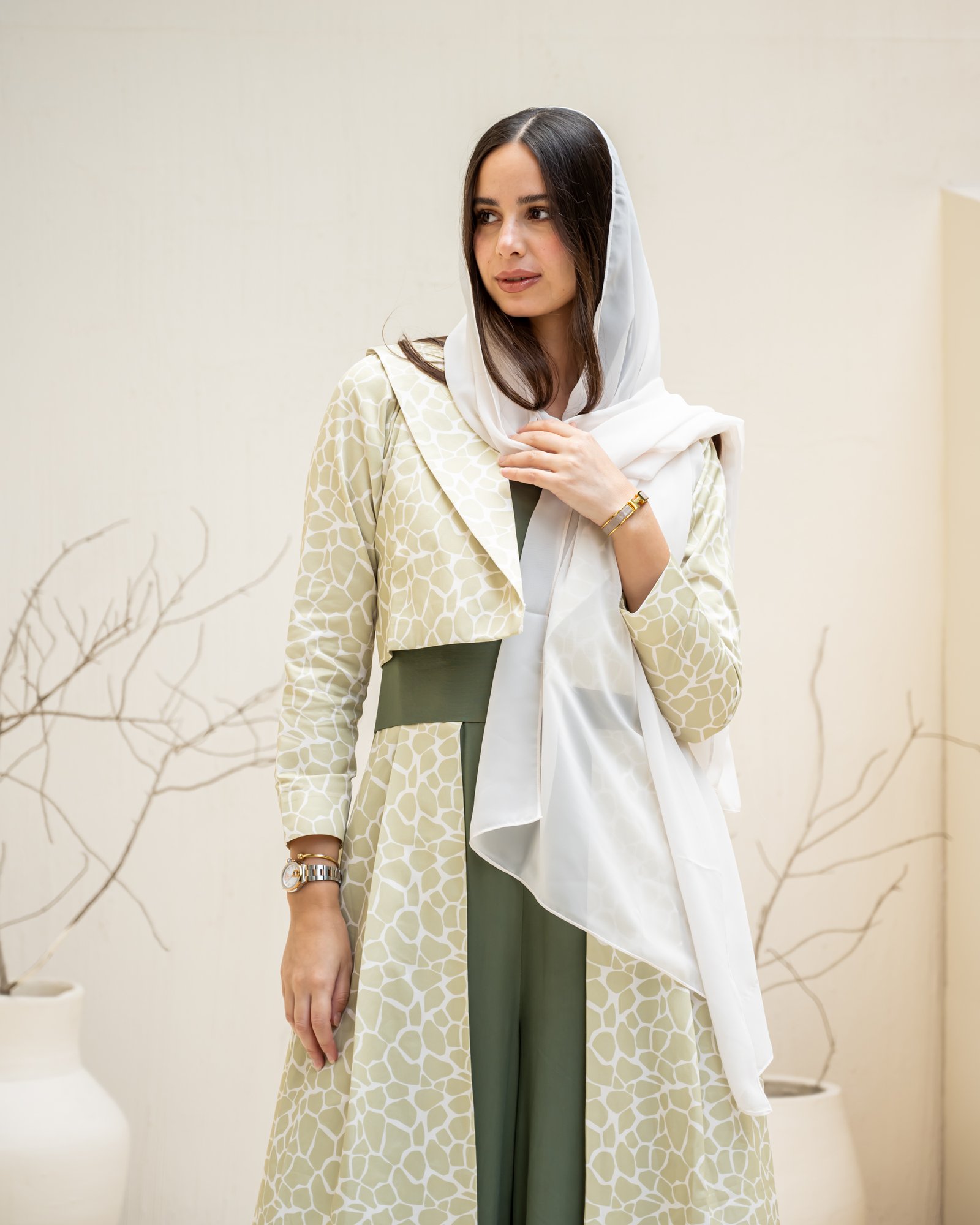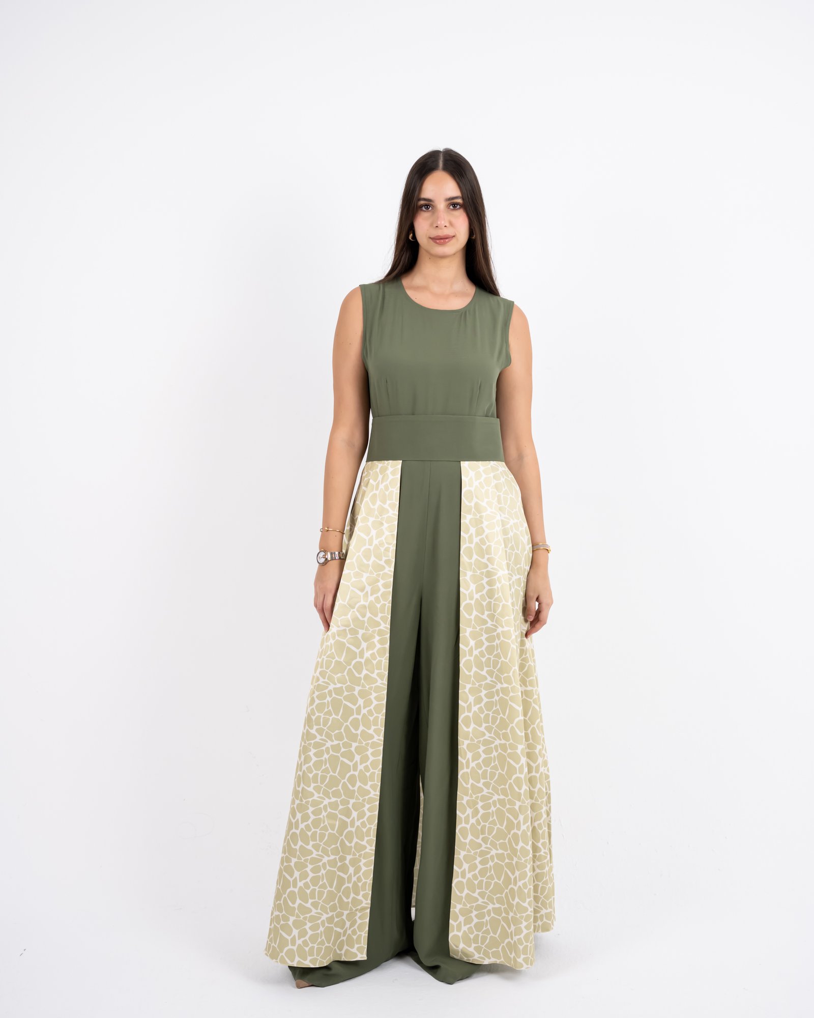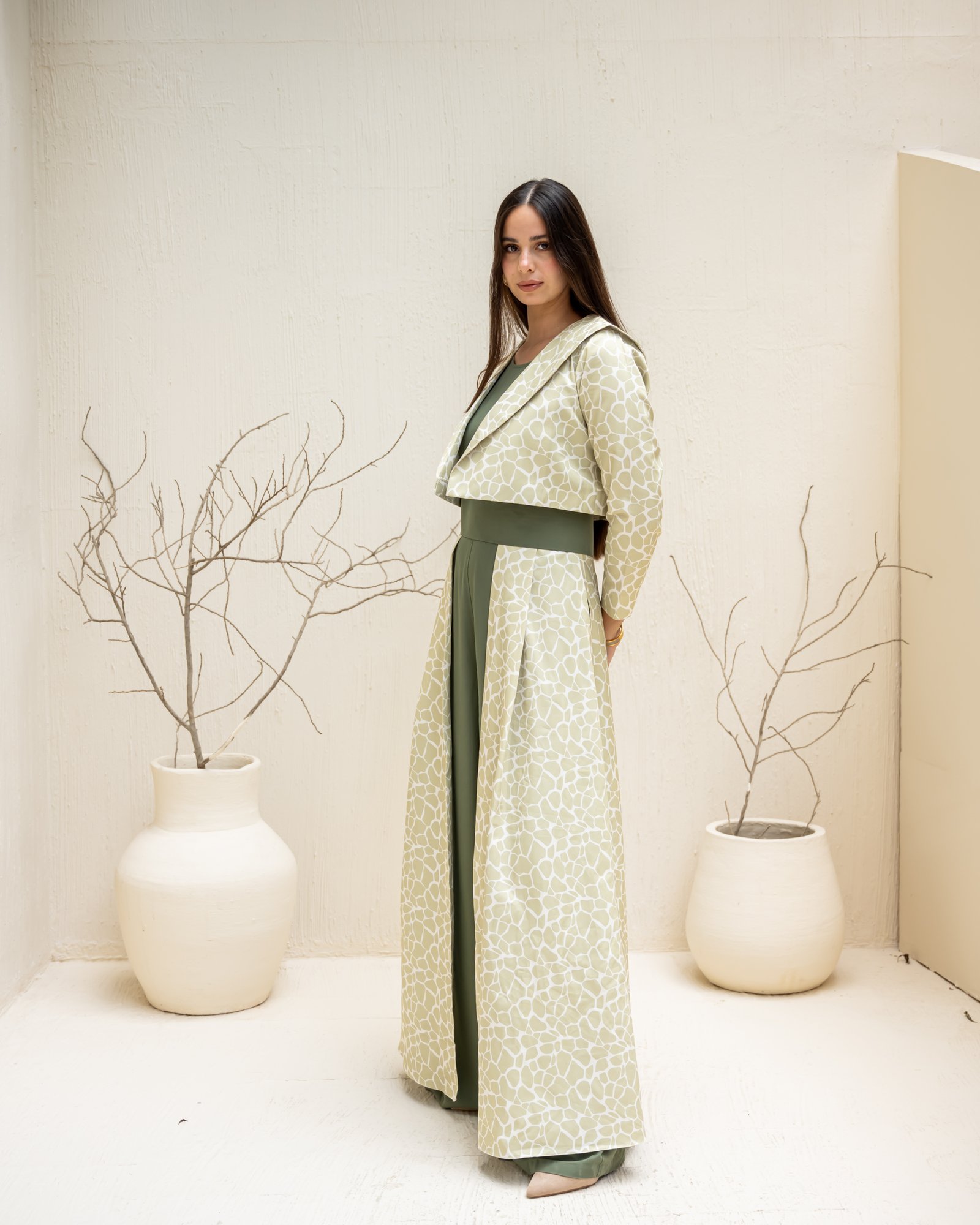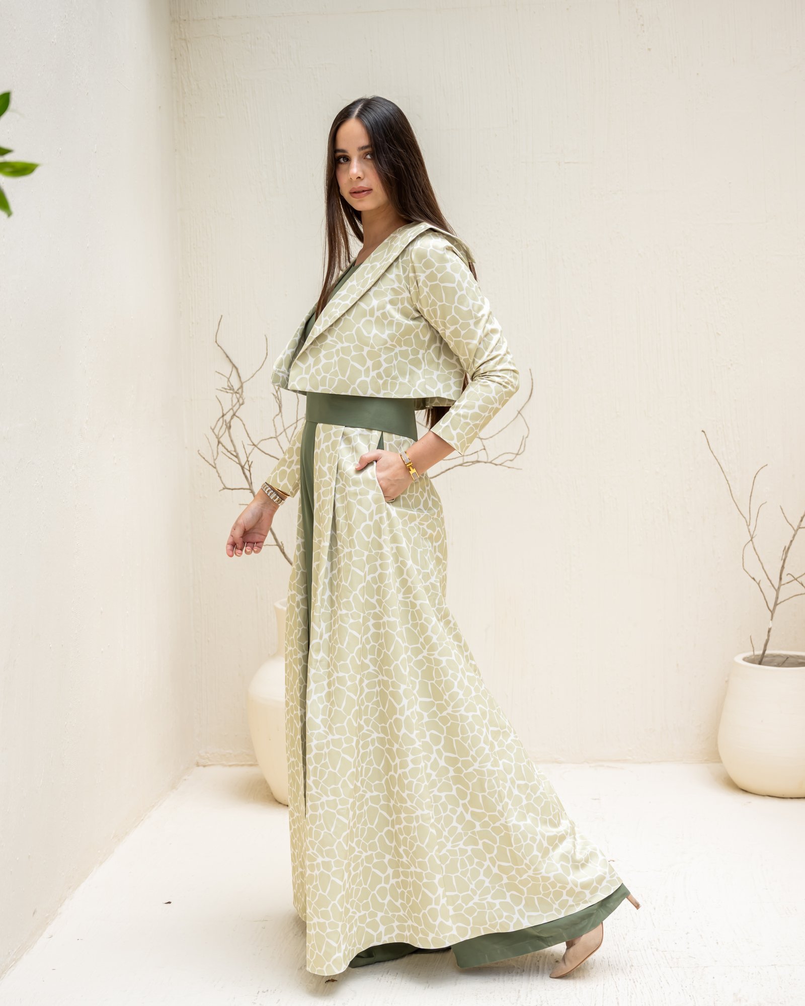 This outfit redefines elegance with structure and flow. The olive-green sleeveless jumpsuit forms the base, accentuated by a detachable belt that highlights the waistline. The beige patterned skirt layer adds soft movement, while the cropped jacket completes the look with balanced sophistication. Versatile, graceful, and bold – this design captures Razia’s signature blend of confidence and contemporary modesty.
