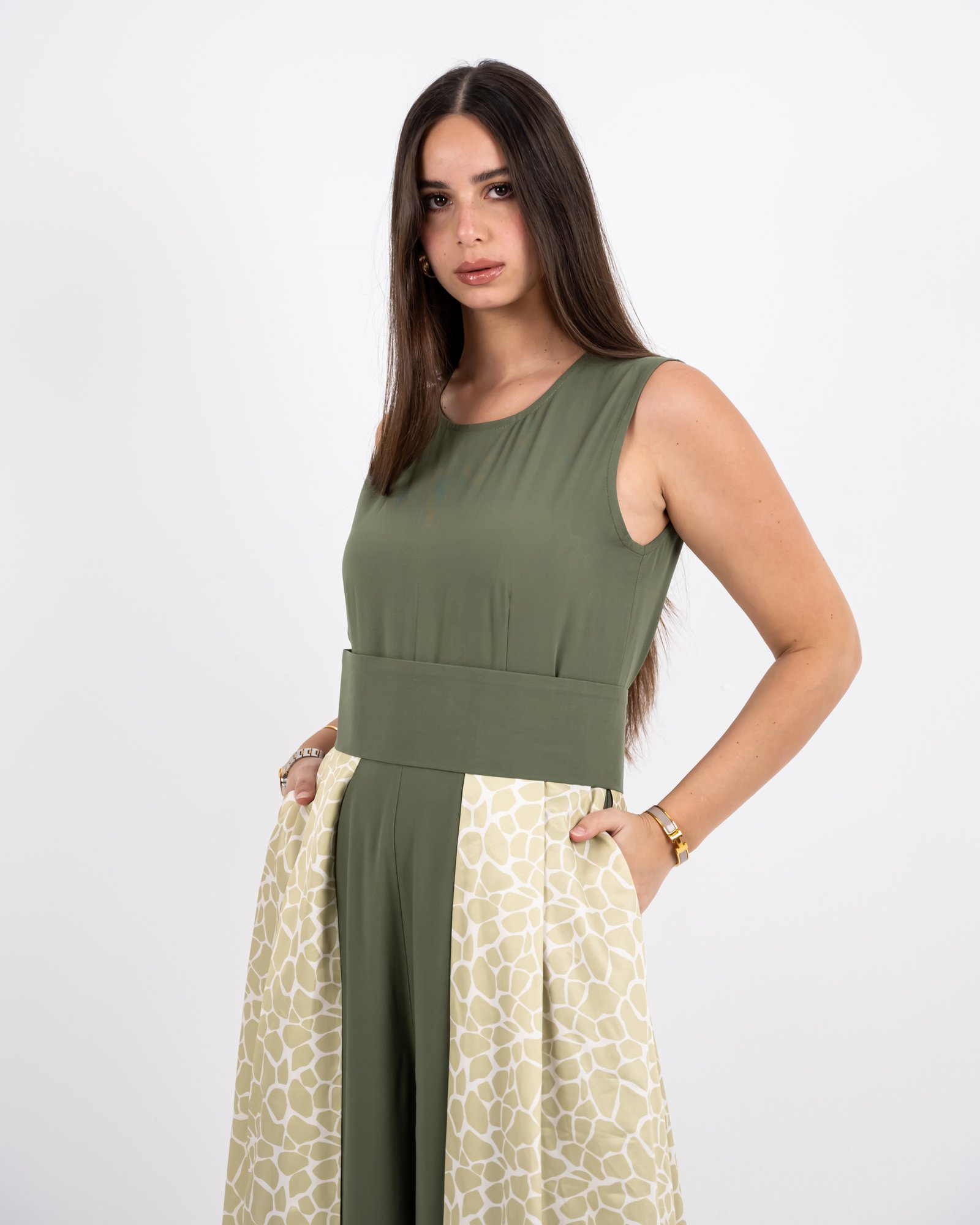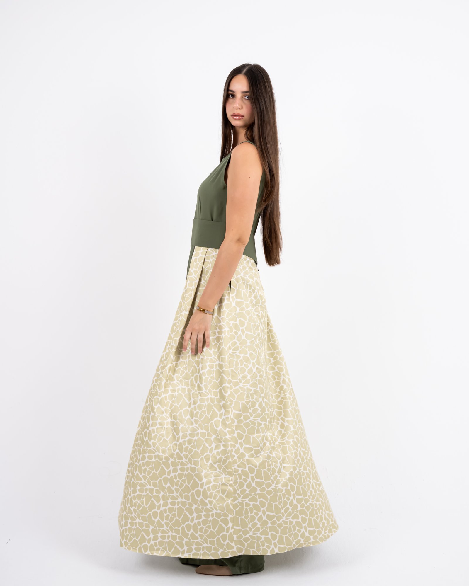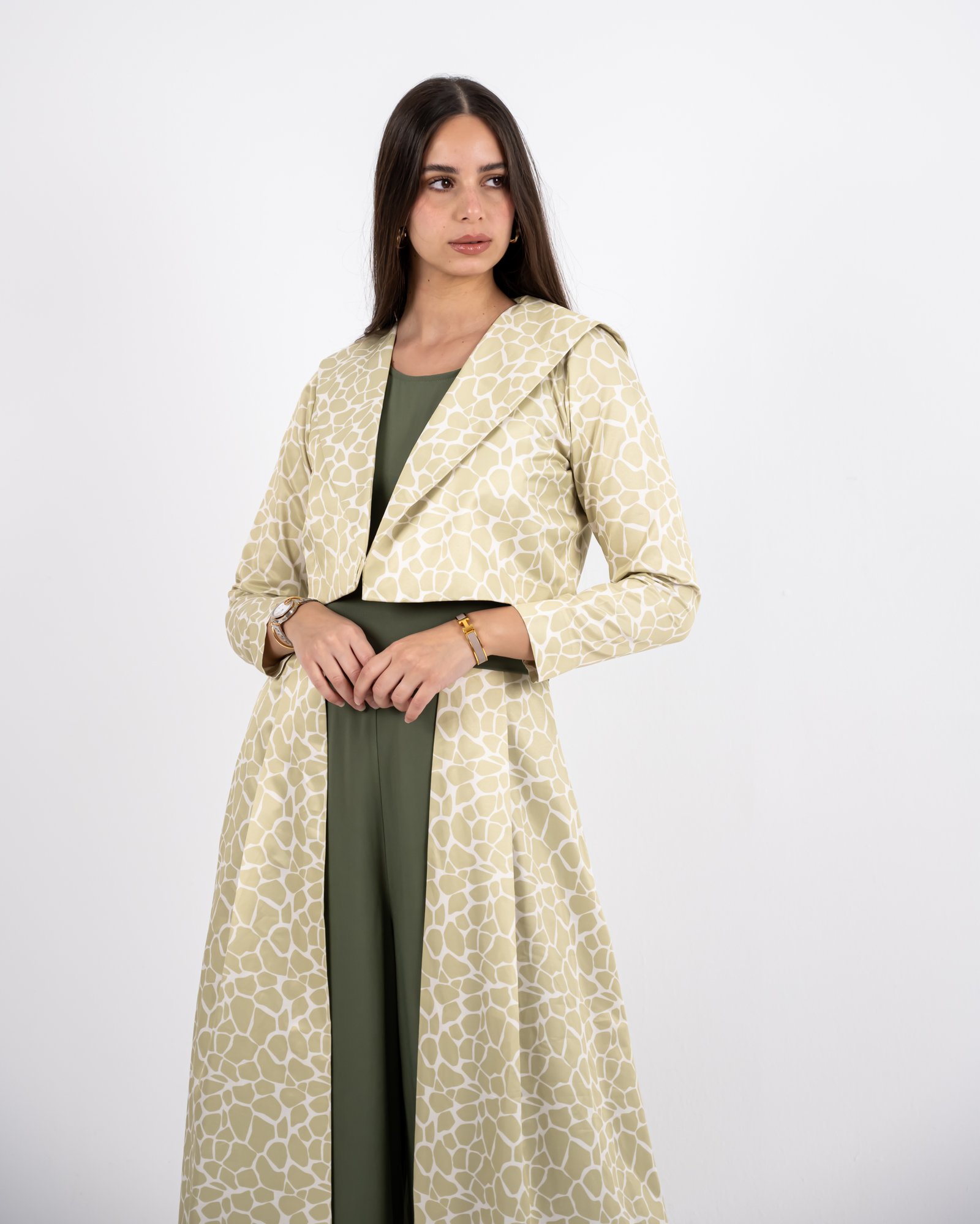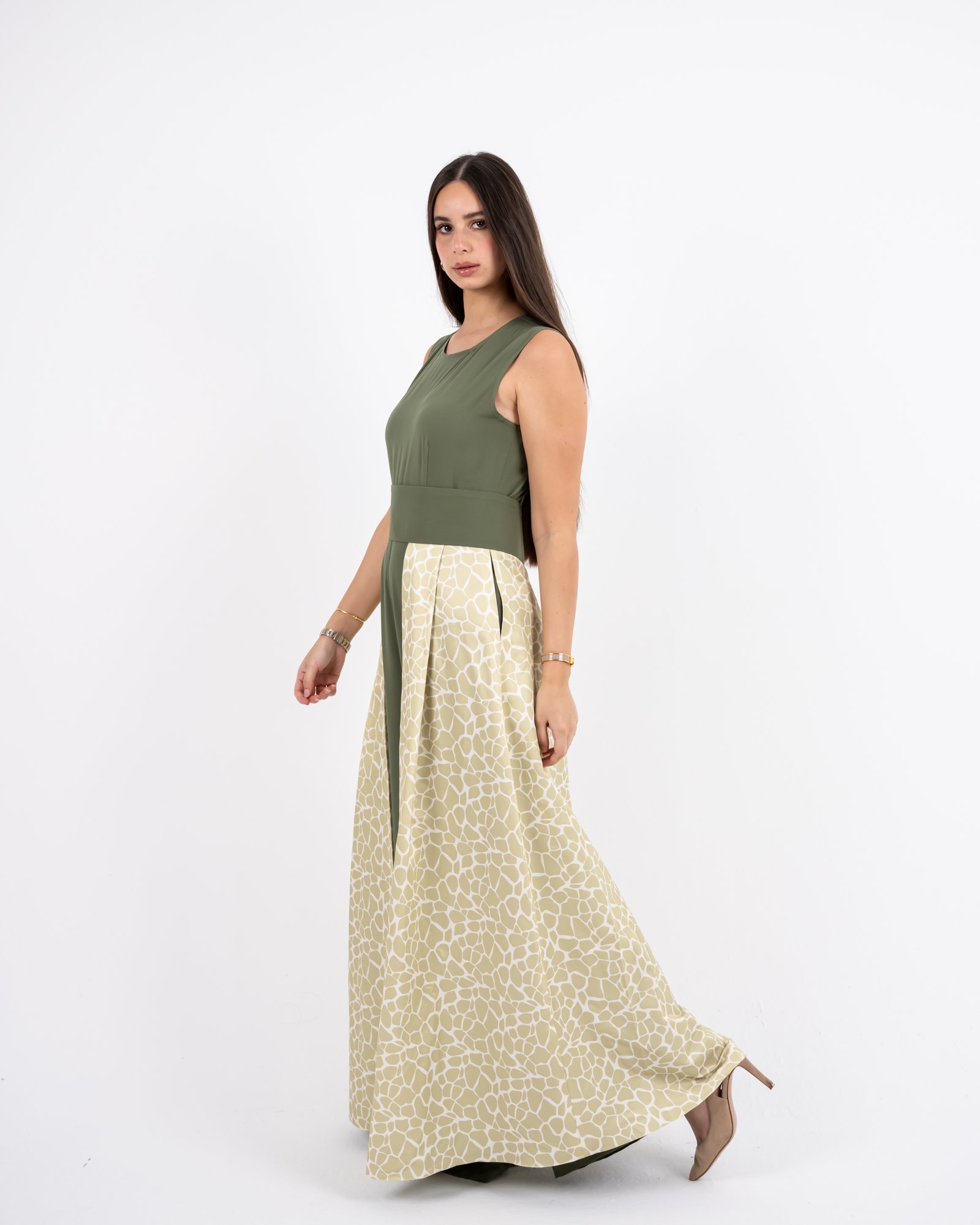 This outfit redefines elegance with structure and flow. The olive-green sleeveless jumpsuit forms the base, accentuated by a detachable belt that highlights the waistline. The beige patterned skirt layer adds soft movement, while the cropped jacket completes the look with balanced sophistication. Versatile, graceful, and bold – this design captures Razia’s signature blend of confidence and contemporary modesty.