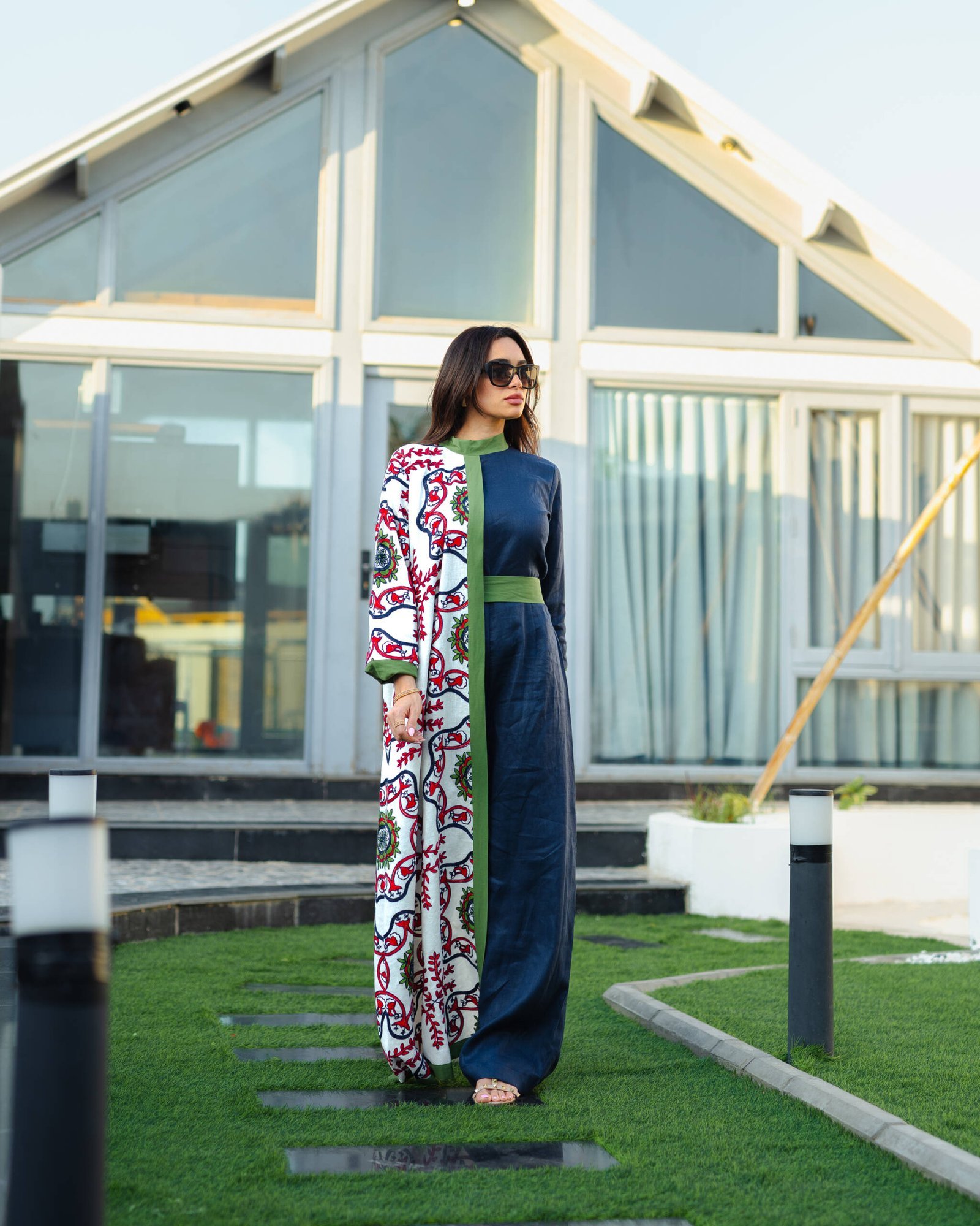 This modern navy jumpsuit is crafted from soft, lightweight linen that moves effortlessly with you. The standout feature is the embroidered side panel, designed with rich, traditional-inspired motifs in vibrant colors like red , green , and navy. The embroidery adds a statement-making touch, balancing comfort with confident elegance. it’s a piece made for women who value both ease and individuality in their everyday style