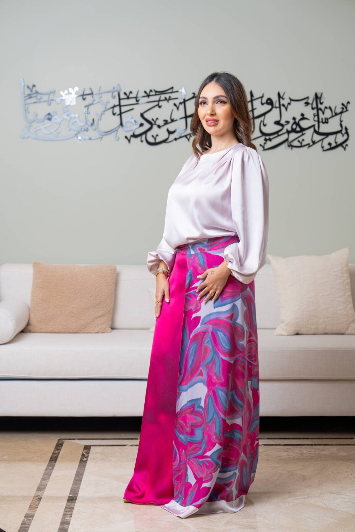 A fuchsia or blue satin skirt paired with a bold printed overlay that wraps around the waist — a dynamic duo of elegance and energy