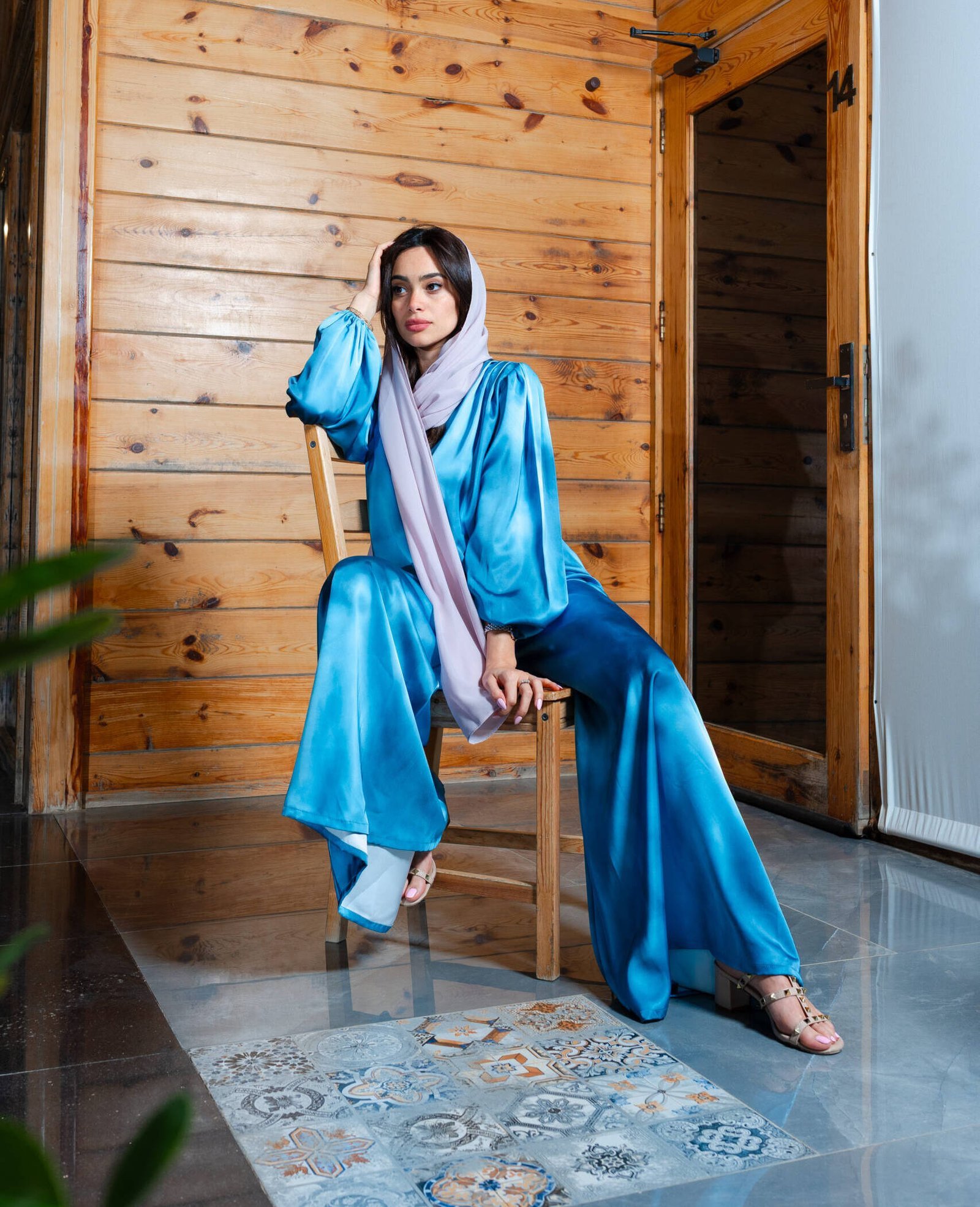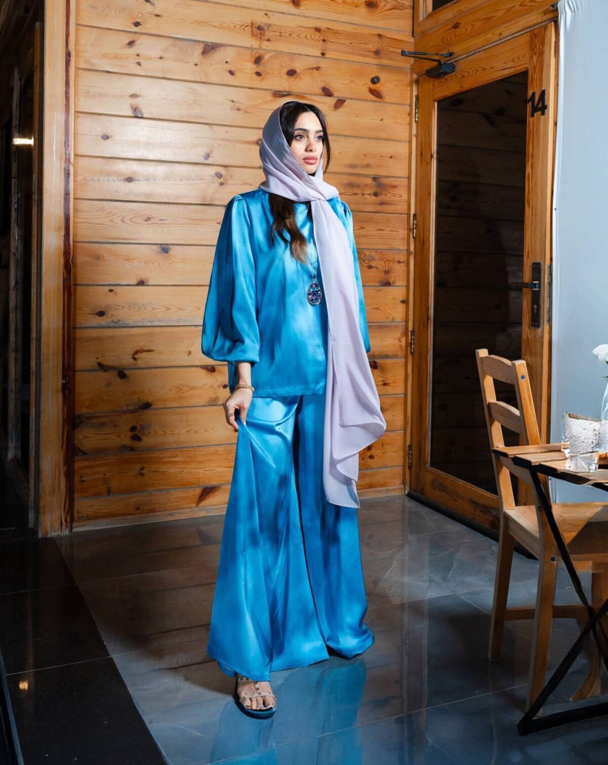 Wide-leg satin trouser in wavy blue or fuchsia smooth, airy, and made to move with ease