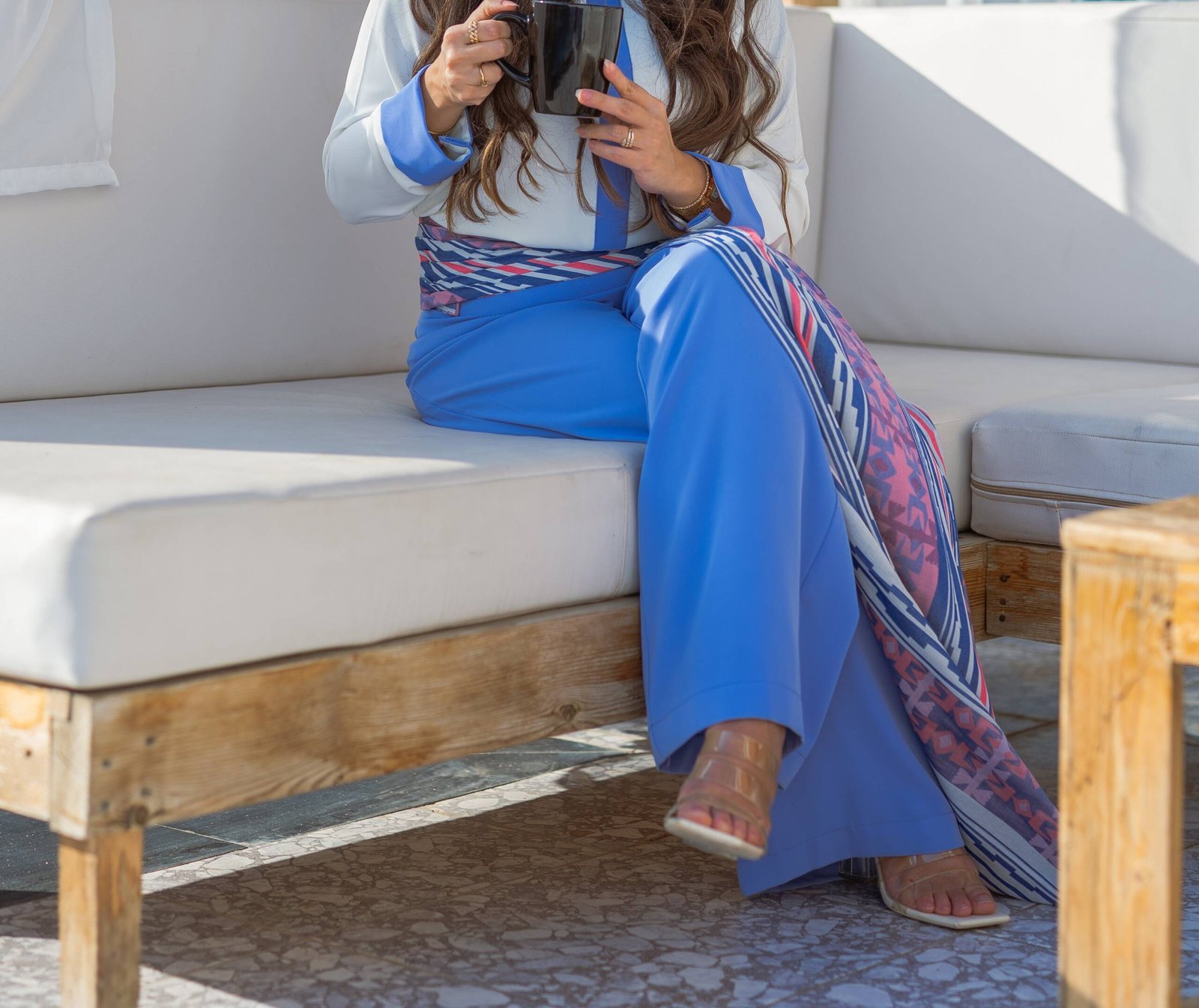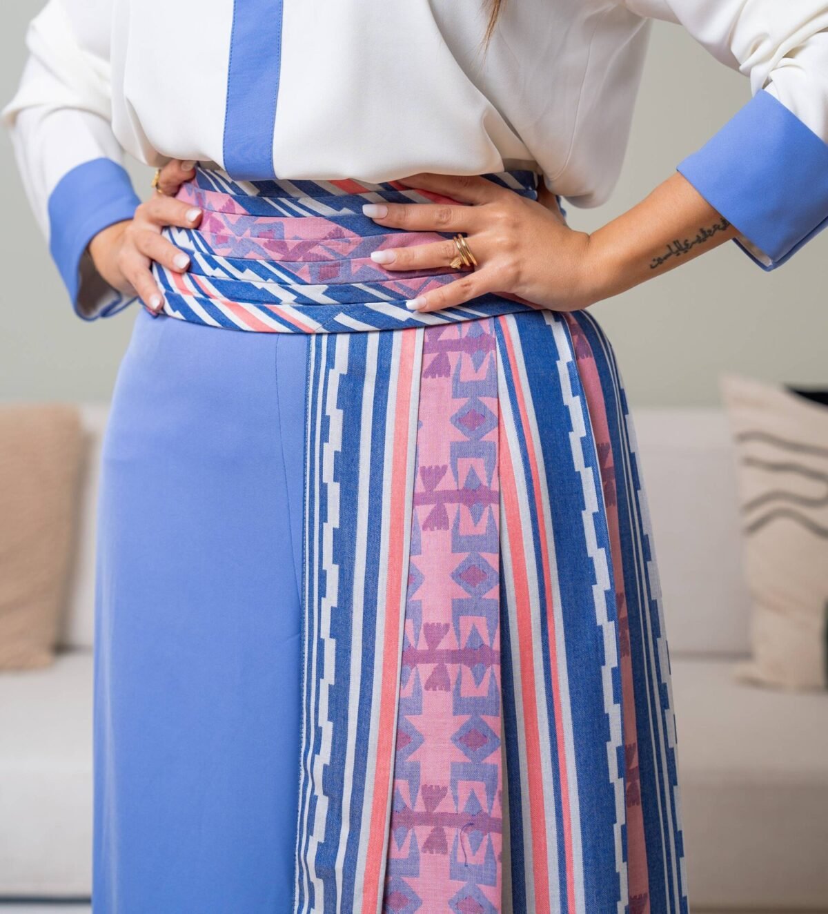 Wide-leg trousers made from a viscose-linen blend, featuring a colorful wrap skirt tied at